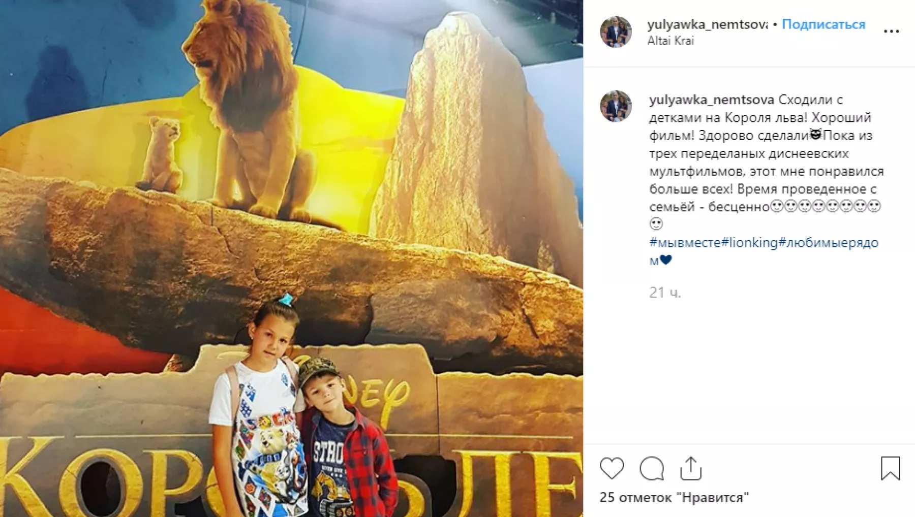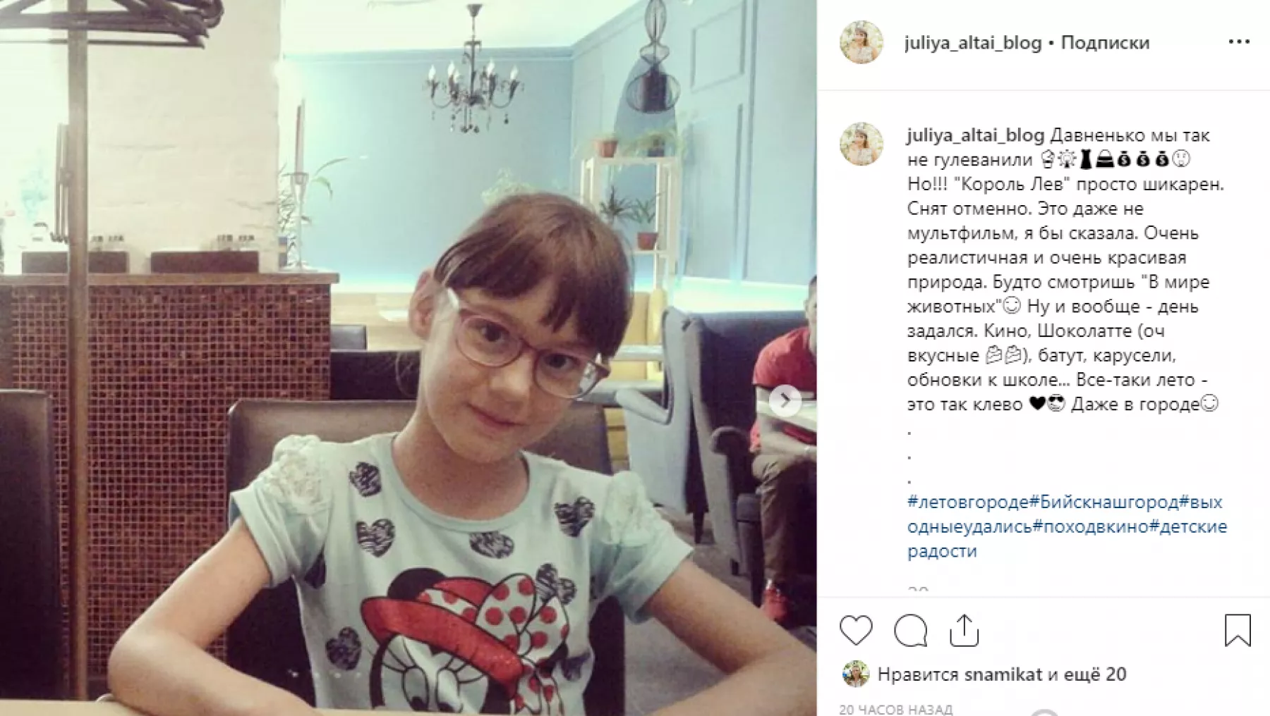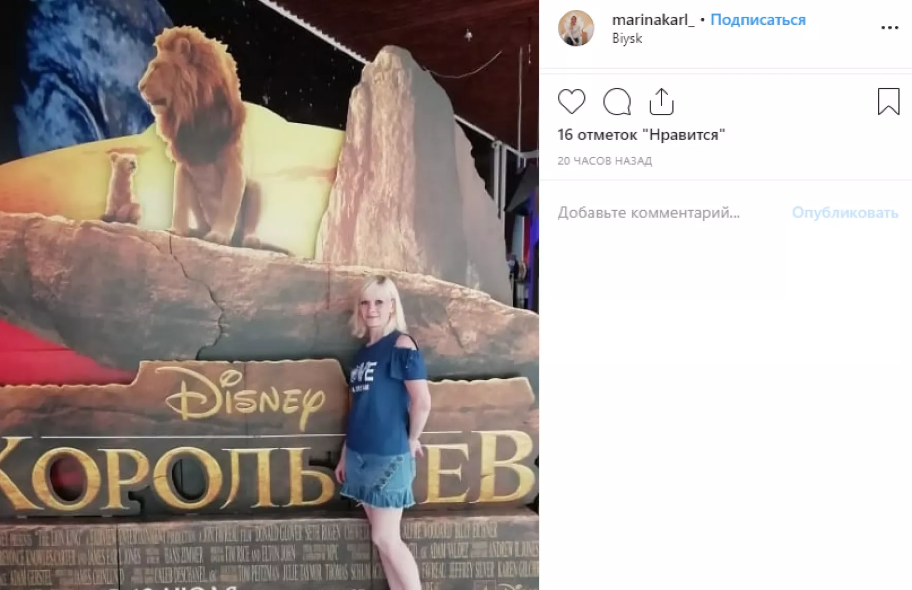 Кажется, на выходные половина города побывала в кинотеатрах на масштабной премьере ремейка «Короля Льва». Соцсети переполнены фотографиями с рекламными постерами фильма. Причем, бийчане фотографировали у афиш не только маленьких детей, но и с удовольствием делали селфи. Многие пишут в отзывах, что «рыдали как в детстве, но фильм – просто чудо!».