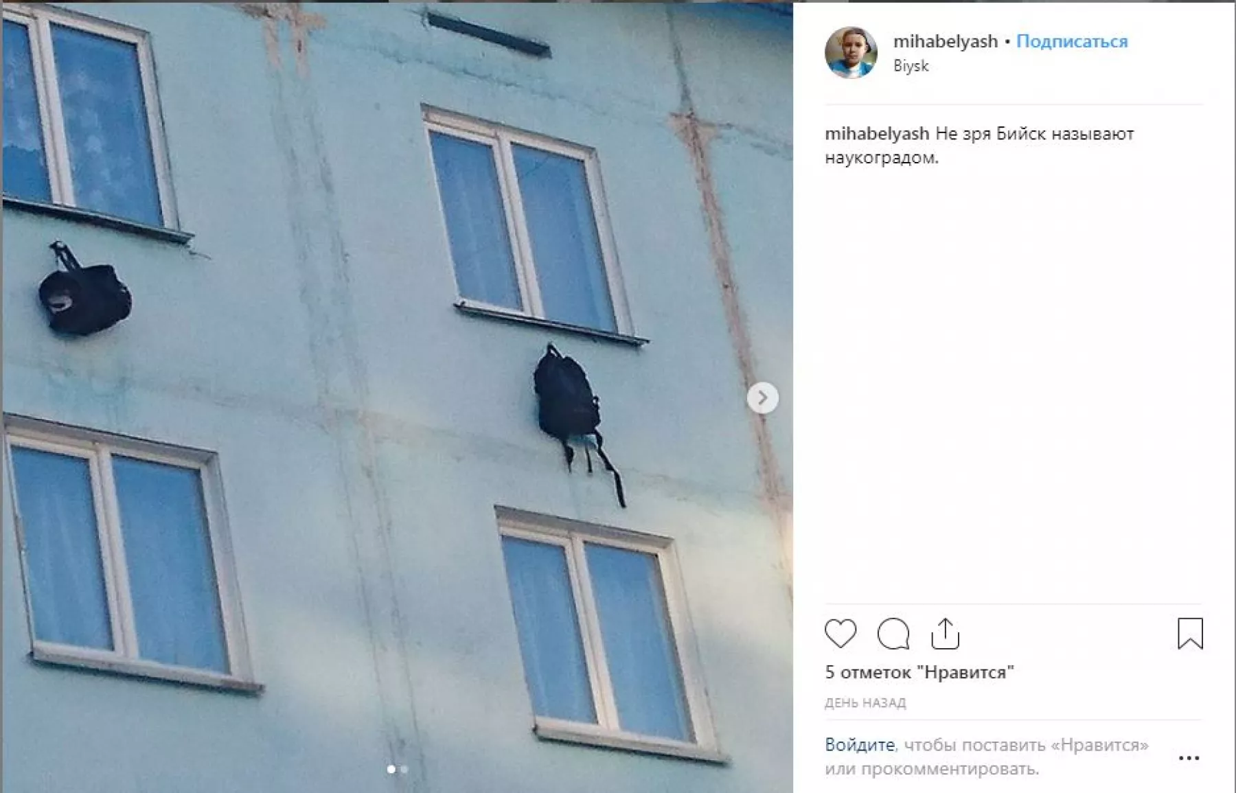 Снимком поделился пользователь mihabelyash. На фотографии хорошо видно, что под окнами пятого этажа висят спортивная сумка и рюкзак. Что находится внутри сумок, неизвестно. Возможно, находчивые горожане вспомнили о самом простейшем холодильнике и вывесили «на мороз» продукты. На это намекает и подпись к фотографиям: «Не зря Бийск называют наукоградом».
