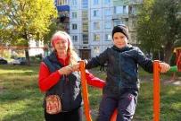 Вера Александровна тоже решила освоить один из тренажеров.  И судя по сосредоточенному выражению лица, женщина уже планирует следующие свои действия по благоустройству родного двора.