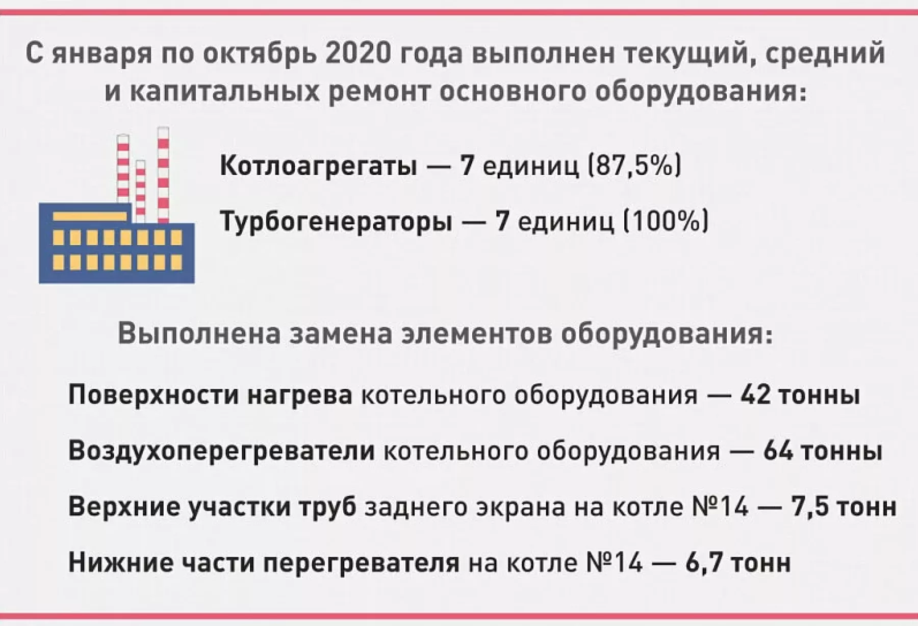 В реестре ремонтов, которые проводятся на ТЭЦ из года в год, первым блоком идет перечень технических мероприятий, направленных на обеспечение стабильной работы станции в пик зимних нагрузок. Главный упор — на восстановление и повышение надежности оборудования. Выполнение программы ремонтов Бийской ТЭЦ в 2020 году на текущий момент составляет 73%. Поясняем: проведение ремонтных и профилактических мероприятий на станциях рассчитано на весь год и не заканчивается накануне запуска отопления. Работы, которые можно вести в отопительный период, равномерно распределяются в течение всех 12 месяцев.