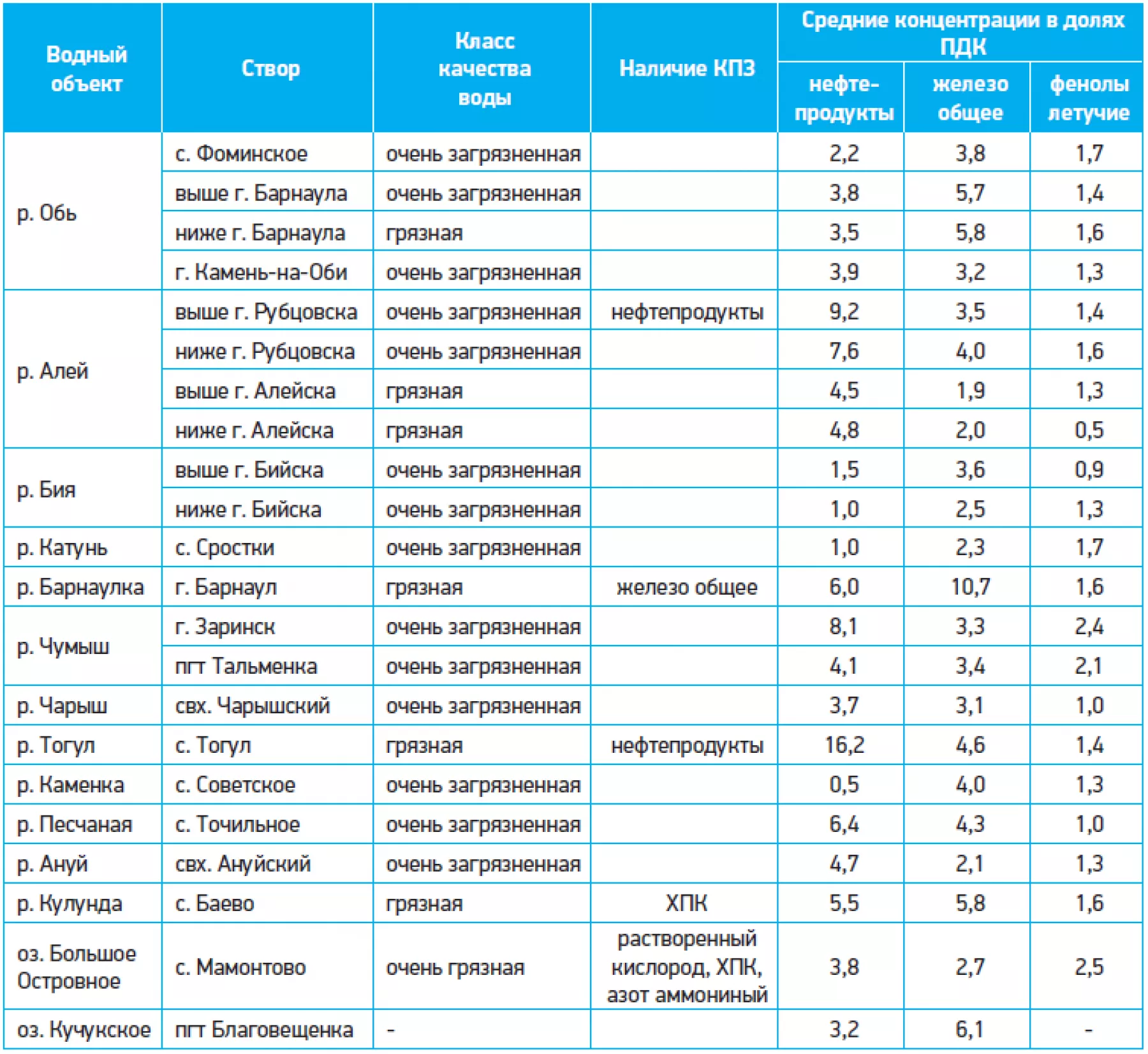 Отмечается и рост средней концентрации железа. Так, за год в водах Бии он повысился с 1,6 до 3,6 предельно допустимых концентраций.
