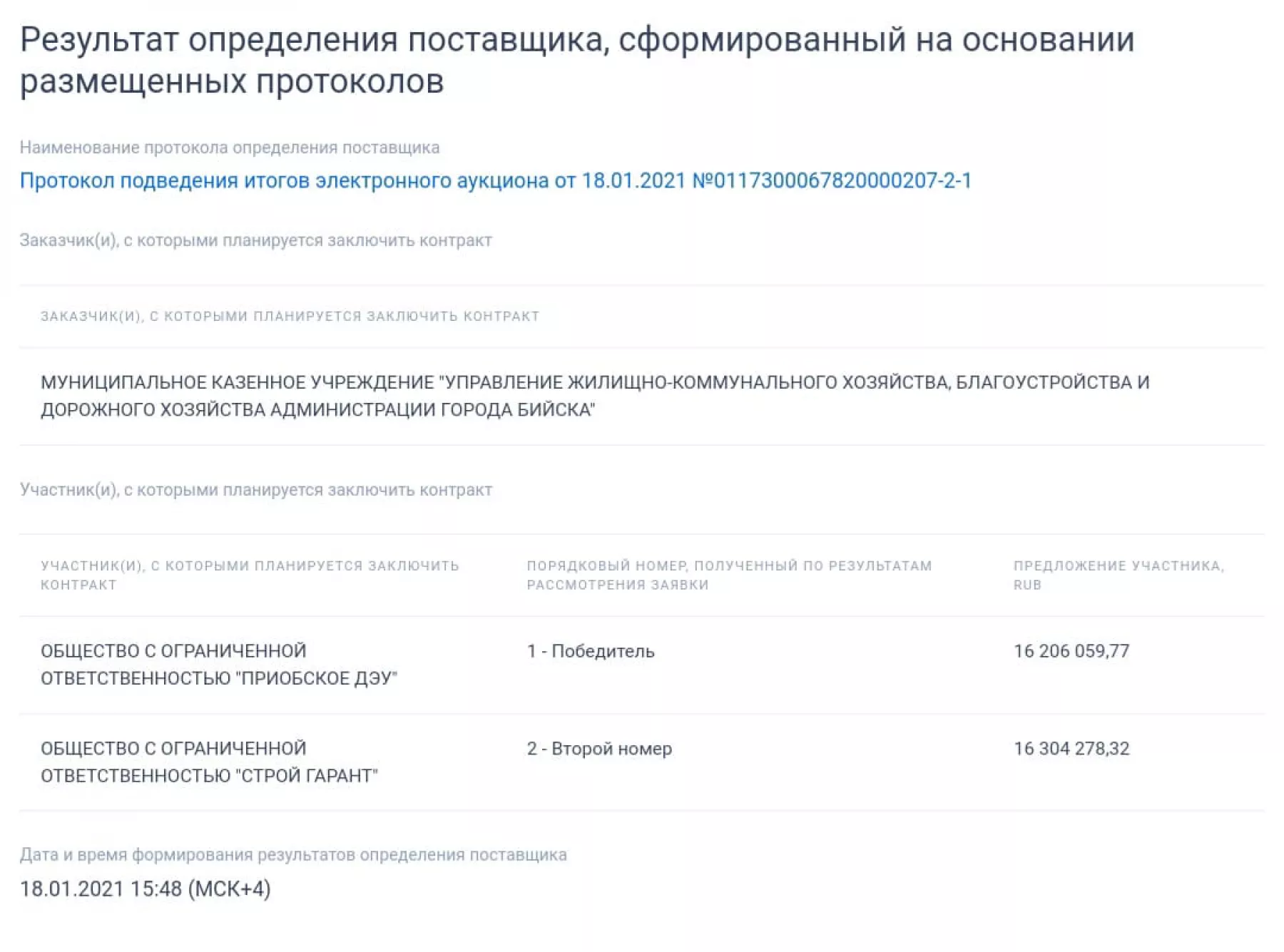 Оба претендента на обслуживание Восточной части города предложили свои услуги за немногим более 16 млн руб. Победителем стало «Приобское ДЭУ», и ранее обслуживавшее городские дороги. Предприятие выиграло тендер, назвав цену в 16,2 млн руб.