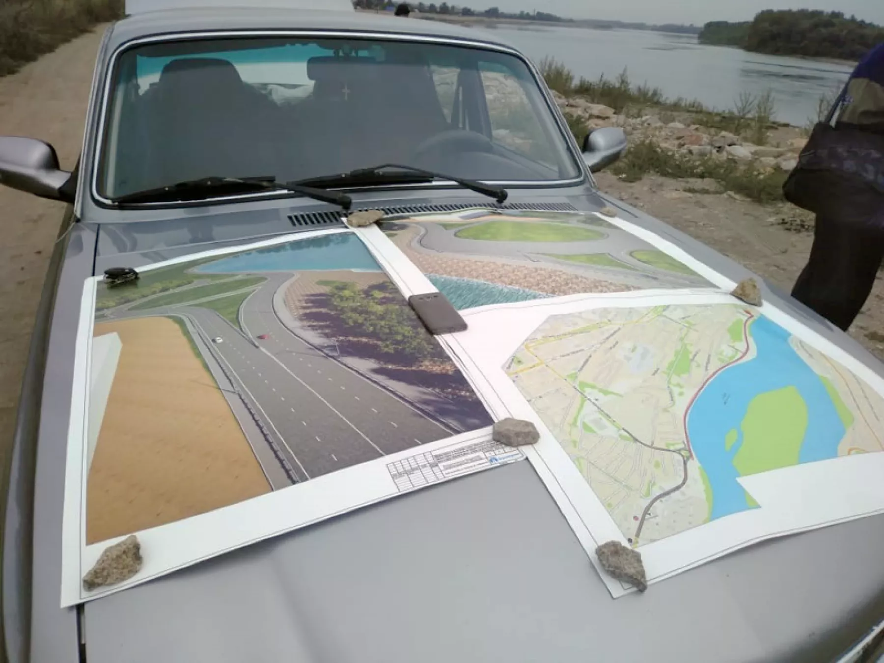 Два года назад, в сентябре 2018 года, на месте, у достроенной дамбы, проектировщики компании «Доргеопроект» представляли, как будет выглядеть будущая дорога (от Коммунального моста до первого поста на Зеленке) и заезд на нее, разместив макеты на капоте «Волги».