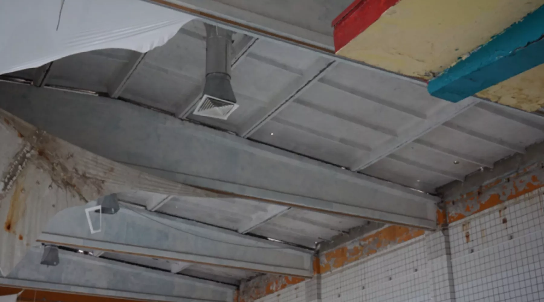 Здесь, в основном зале бассейна, с кровли откололся кусок конструкции. Он пробил натяжной потолок и упал в воду. В это время в бассейне шла тренировка, но никто - ни спортсмены, ни тренеры не пострадали. В тот же день руководство спортивного учреждения закрыло эту часть «Дельфина» для посещений.