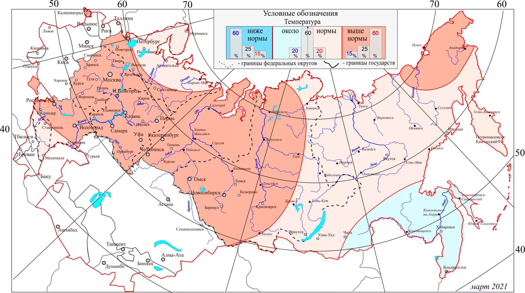- Выше нормы средняя месячная температура воздуха ожидается в Центральном, Приволжском, Уральском федеральных округах, на большей части Южного и Сибирского федеральных округов, а также на Чукотке, - сообщили в Росгидромете.