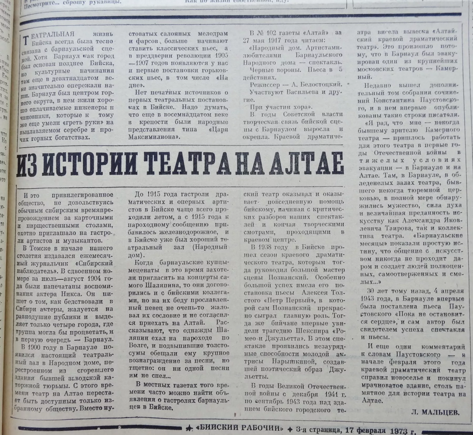 Кроме того, Леонид Александрович был постоянным членом художественного совета при Бийском театре. Для театра же он написал пьесу «Андромеда». В ней он соединил любовь к истории и к литературе. Он ни разу не пропустил ни одной театральной премьеры и ни одного обсуждения! Истории Бийского драматического театра Мальцев посвятил более 20 публикаций в «БР».