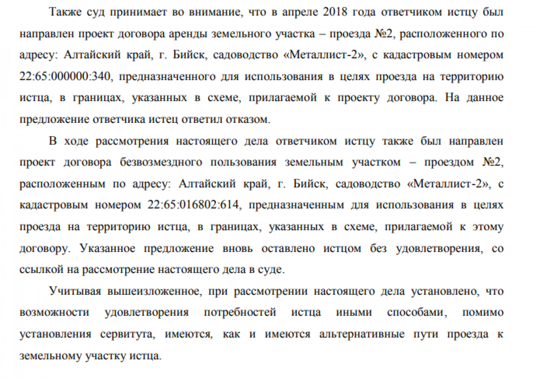 Суд назначил экспертизу. Нанятые специалисты должны были определить - имеются ли варианты альтернативного проезда к садоводческому товариществу «Коммунальщик». Оказалось – есть, и не один. В результатах сказано: «эксперты пришли к выводам о том, что варианты альтернативного проезда (прохода) к земельному участку садоводческого некоммерческого товарищества «Коммунальщик» г. Бийска, помимо проезда (прохода) № 2 (от остановки «Сады-2»), имеются: через земли общего пользования севернее СНТ «Коммунальщик» г. Бийска до федеральной трассы М-52; по территории некоммерческого садоводческого товарищества «Имени Мичурина»; по проезду, разделяющему территорию некоммерческого 6 садоводческого товарищества «Медик» и некоммерческого садоводческого товарищества «Металлист -1»; по территории СНТ «Бийский садовод».