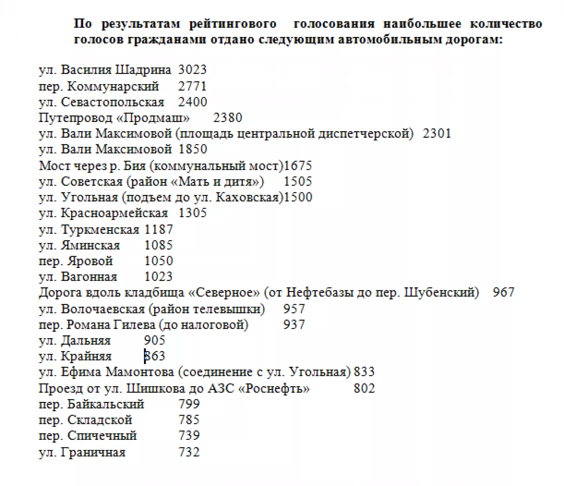 Напомним, более 39 тысяч бийчан приняли участие в формировании рейтинга дорог, в первую очередь нуждающихся в ремонте. Сделать свой выбор им предстояло из 51 дороги. Тогда в администрации пообещали, что 25 «победителей» голосования будут отремонтированы в 2019 году. Поэтому возможно, представленный пока список – не окончательный.