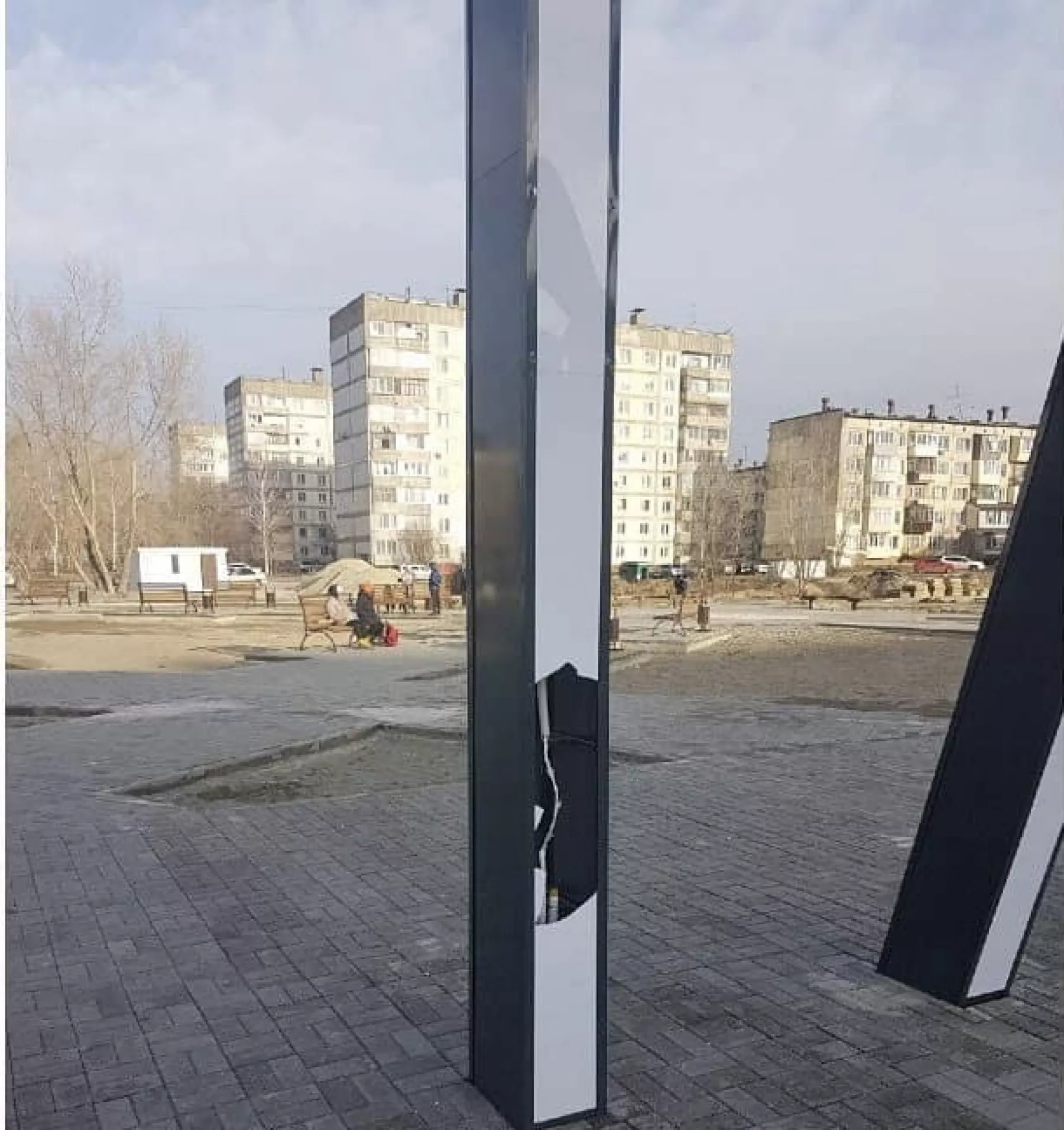 Впечатляющая арка из столбов, служащая воротами в парк за «Ривьерой» уже подверглась набегу вандалов. На одном из столбов нехорошие люди пробили большую дыру. Цель данного набега неизвестна.