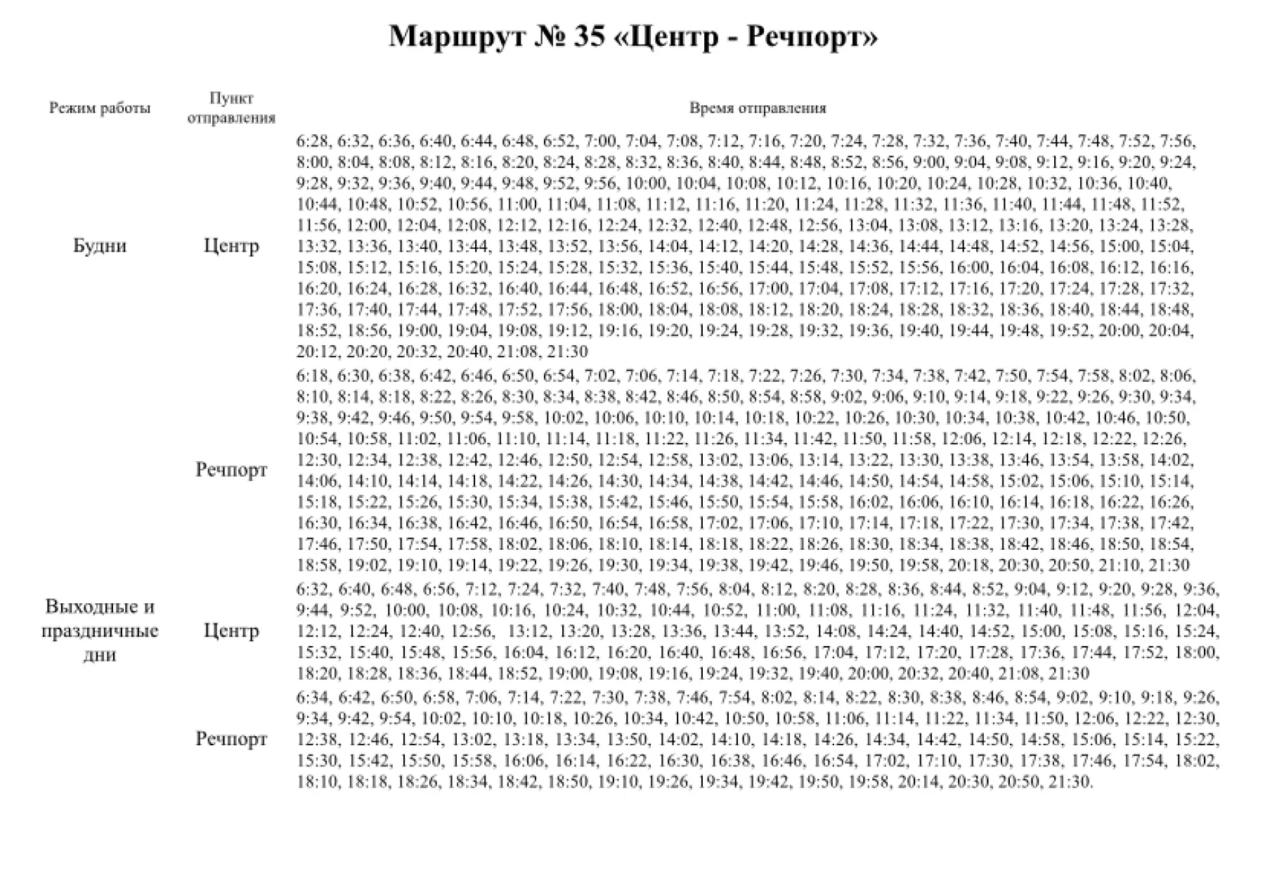 С 1 декабря по маршруту № 35 «Центр – Речпорт» в выходные и праздничные дни сократиться интервал движения в обеденное время. Вместо часового перерыва, автобусы теперь будут идти каждые 16 мин.