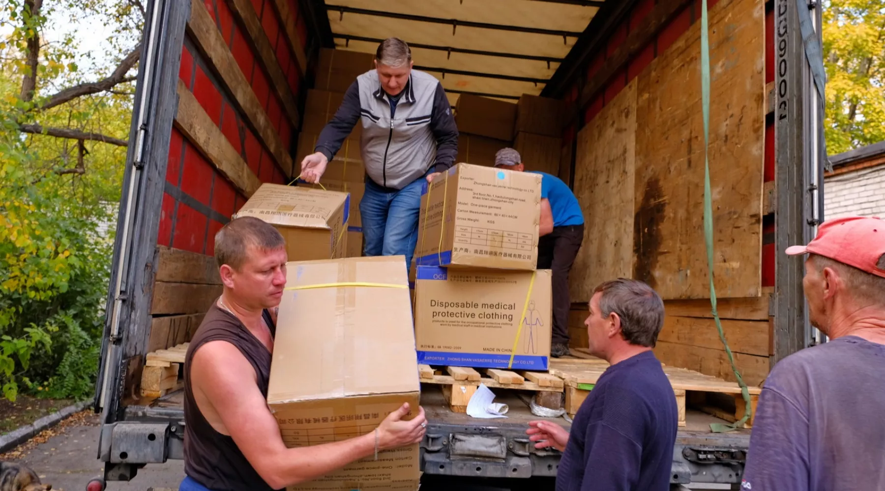 Большегрузы из краевой столицы прибыли в Бийск с утра. Машины забиты коробками с надписями на английском и китайском языках. Это средства защиты для медиков.