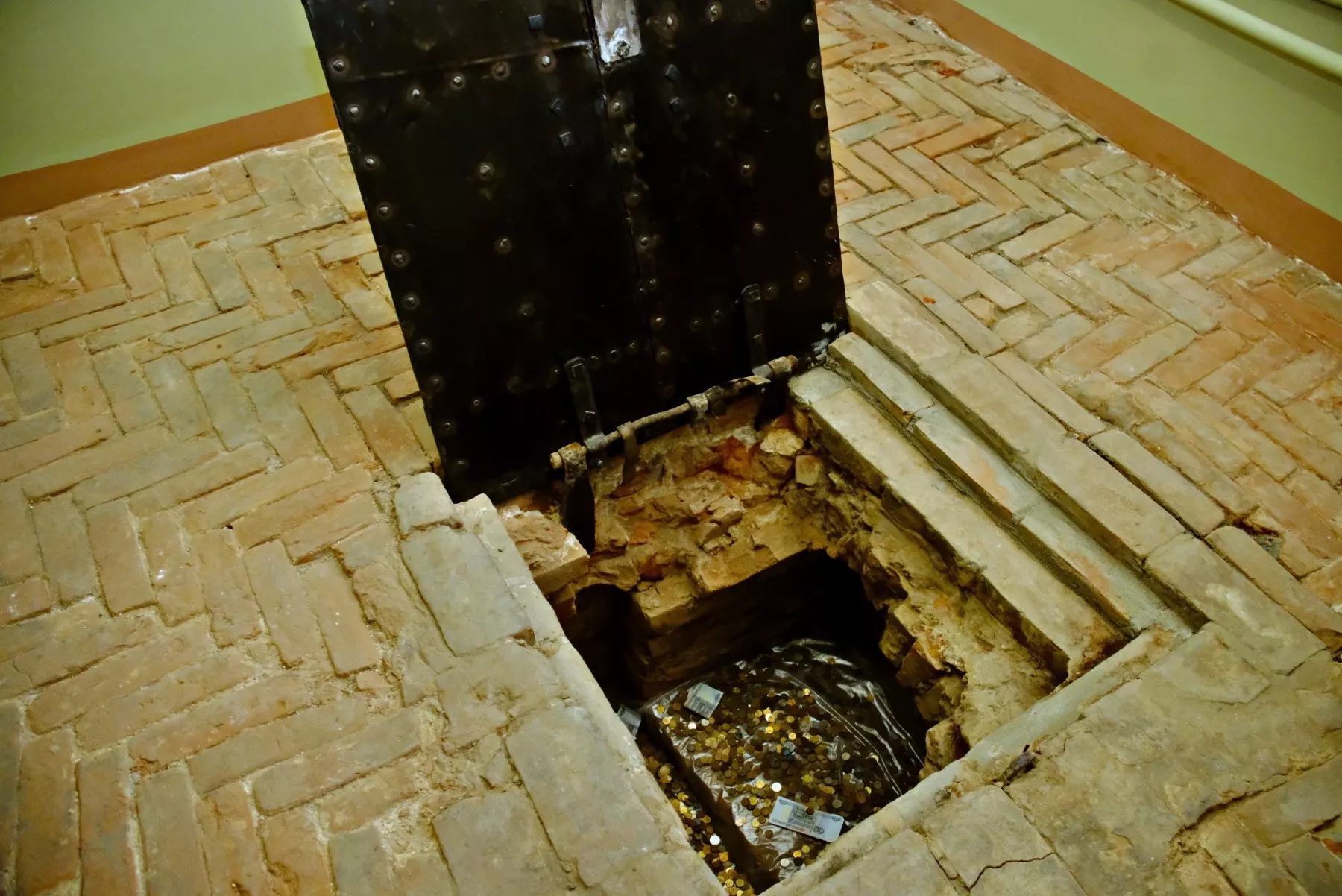 – Одним из брендов музея является помещение исторического казначейства Алтайской миссии, которое сохранилось на первом этаже. Сюда ведет мощная подлинная кованая металлическая дверь с засовом. Более века назад тут хранилась основная часть финансовых средств миссии. Помещение весьма своеобразное, оно имеет сводчатое перекрытие. Не так давно мы убрали сгнившие деревянные советские половицы. И под ними нашли подлинный каменный пол, выложенный кирпичом в виде паркета. Он чудом уцелел, и дошел до нас в очень хорошем состоянии. Здесь и обнаружили некий лаз, засыпанный землей, мусором и хламом. Как оказалось, это старинный сейф, встроенный прямо в каменный пол. Его нельзя перенести или вынести. К сожалению, крышка сейфа не сохранилась, поэтому, наш мастер по образу и подобию двери, создал новую, стилизованную под старину.