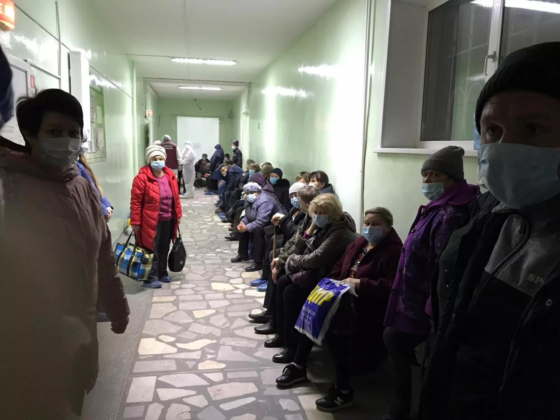 КТ работает до 8 часов вечера, но принять обязаны всех. А очередь не убывает. Скорые подвозят все новых больных с температурой. Плотными рядами ожидающие сидят на стульях в коридоре. А кому не хватило места, опускаются на холодные ступени лестницы, так как стоять нет сил.