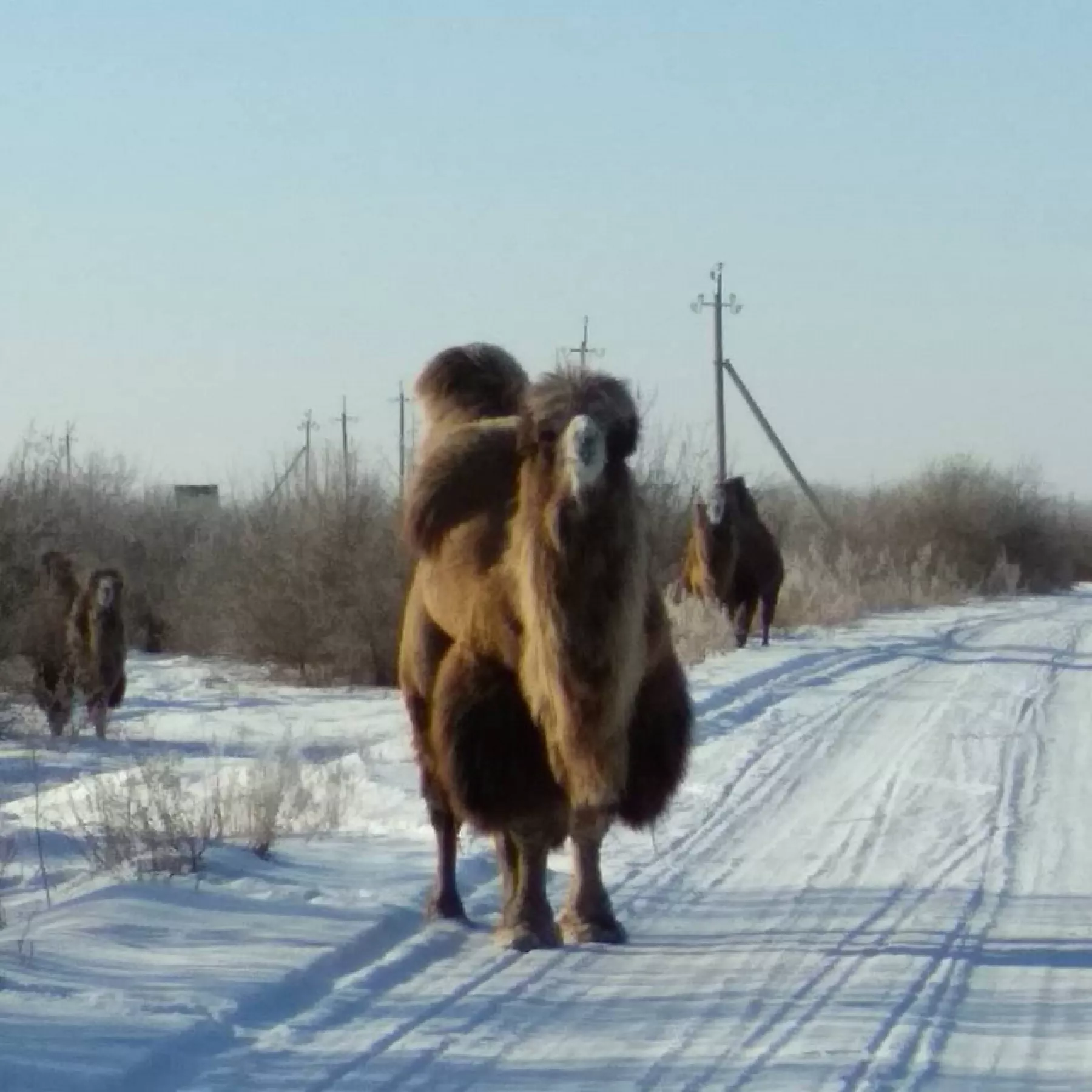 Необычную картину водители увидели на дороге между Кулундой и Родино. В заснеженной степи паслось стало верблюдов. Животные решили перейти дорогу, и один из них перегородил путь ЗИЛу. Водитель грузовика вынужден был объезжать стадо по встречной полосе.