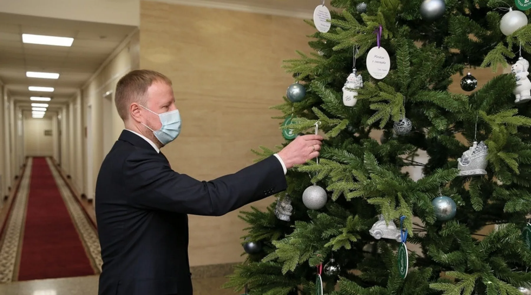 Губернатор Алтайского края Виктор Томенко снял с "Елки желаний", установленной в фойе малого зала Правительства края, несколько игрушек, на которых написаны мечты детей.