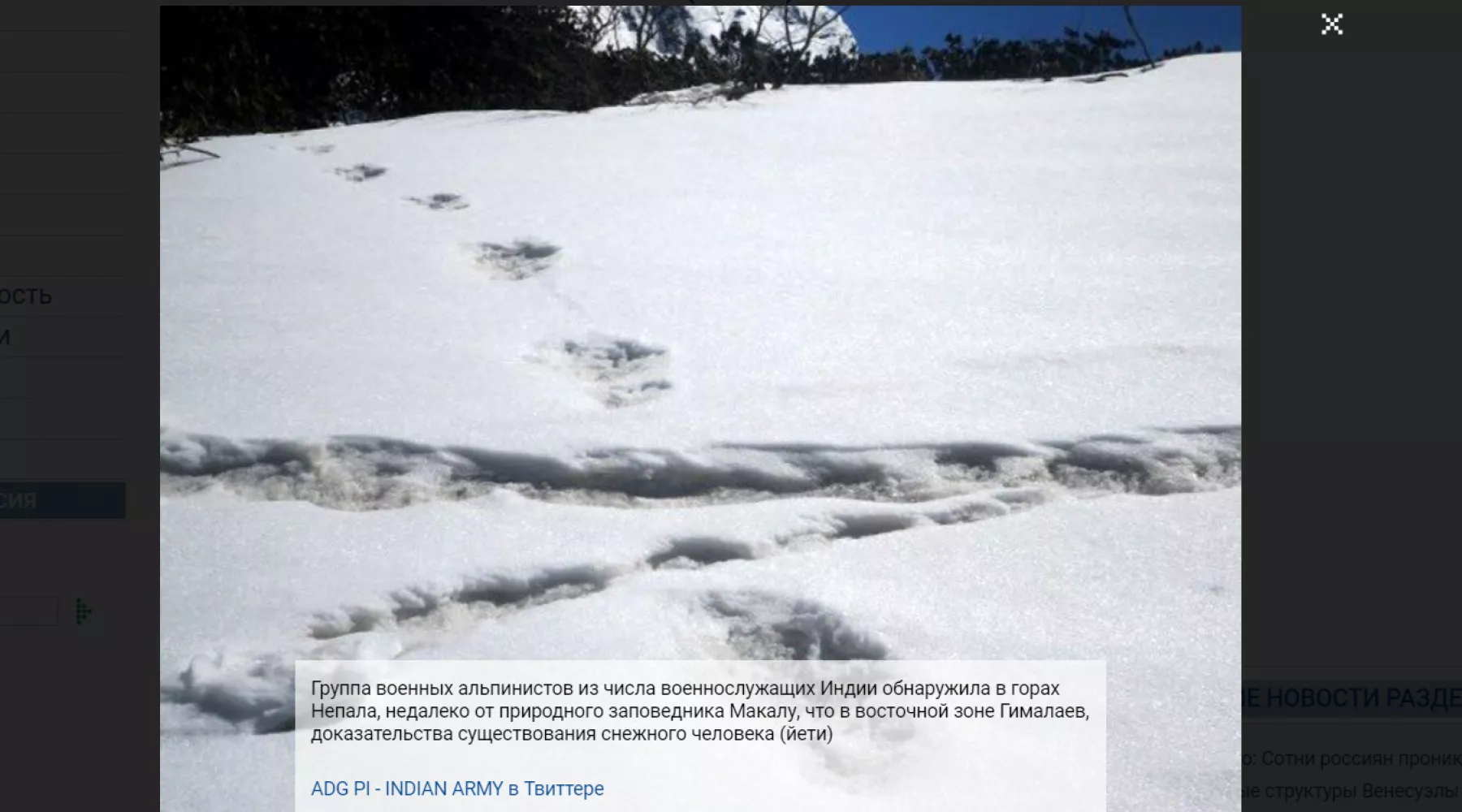 Группа военных альпинистов из числа военнослужащих Индии обнаружила в горах Непала, недалеко от природного заповедника Макалу, что в восточной зоне Гималаев, доказательства существования снежного человека (йети).