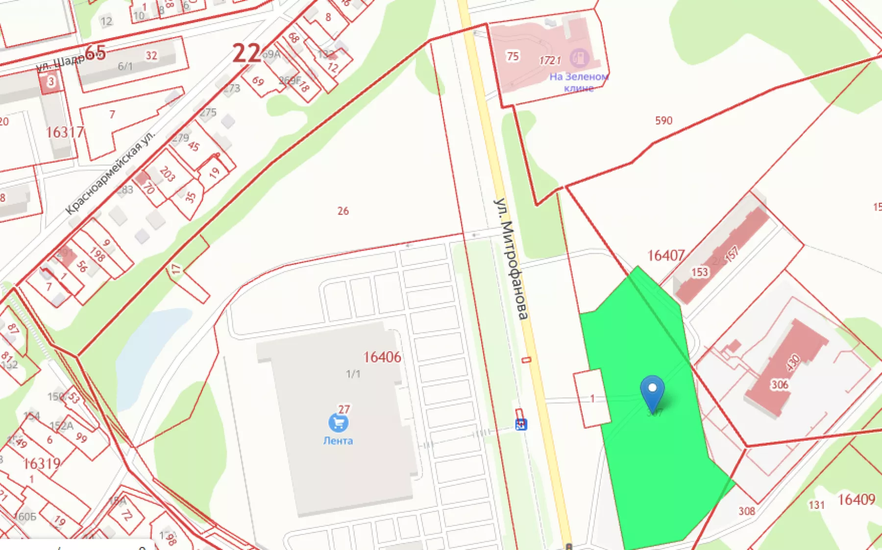 Участок в 340 метрах западнее жилого дома по адресу ул. Зеленый Клин, 30, предлагается в аренду для многоэтажной жилой застройки. Однако на участие в аукционе не поступило ни одной заявки. Аукцион признан несостоявшимся.