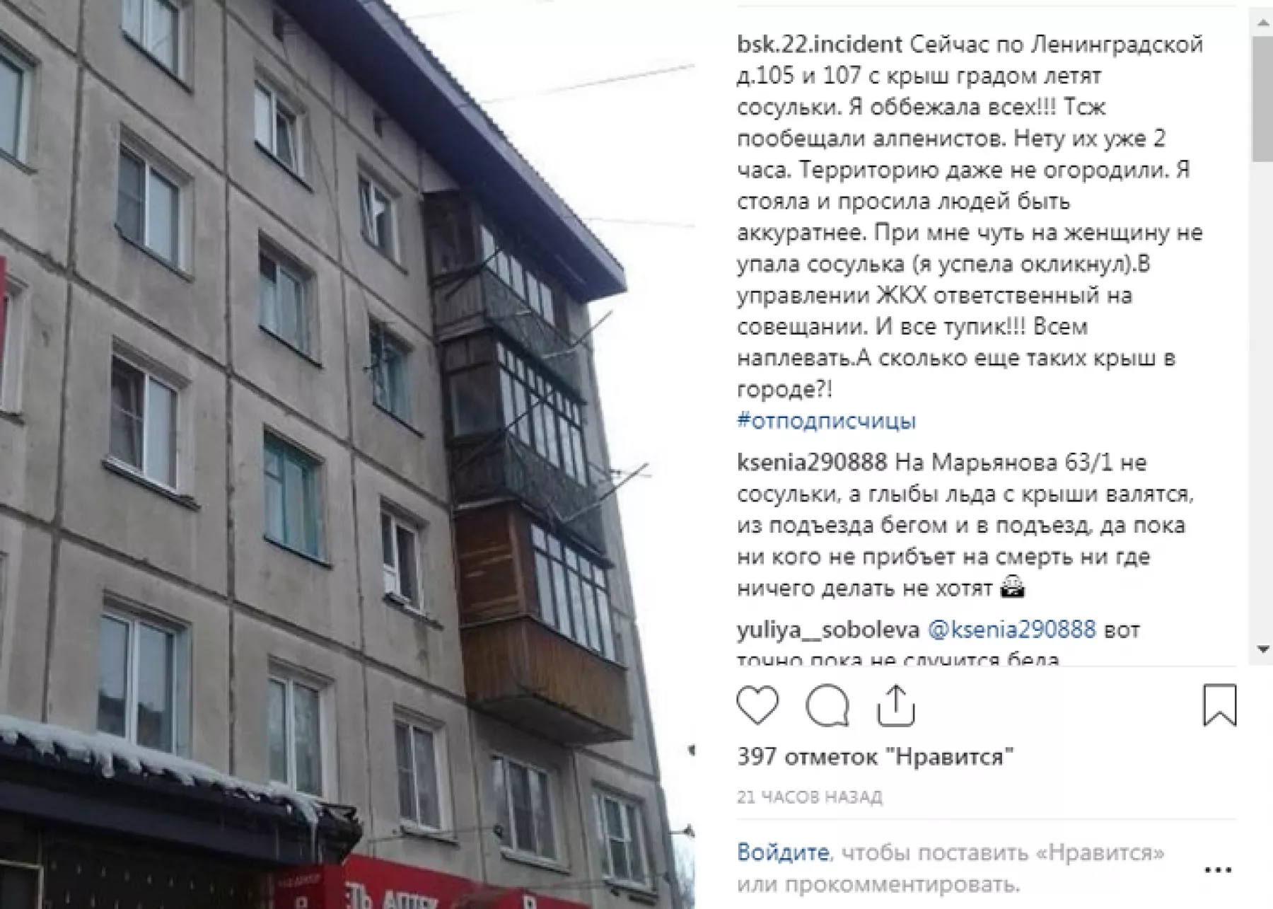 Среди комментирующих пост, нашлись горожане, которые также пожаловались на небезопасность крыш. Так к домам 105 и 107 на Ленинградской, бийчане добавили дом 60/2 на той же улице и адрес Марьянова, 63/1, надеясь, что их услышат и проблема решится.
