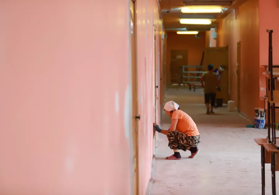 Одновременно с этим, здание школы преображается изнутри: в коридорах шпатлюют стены и готовят их под последующую покраску. К тому же за счет средств гранта конкурса «Я считаю» здесь обустроят кабинет для психологической разгрузки учеников.