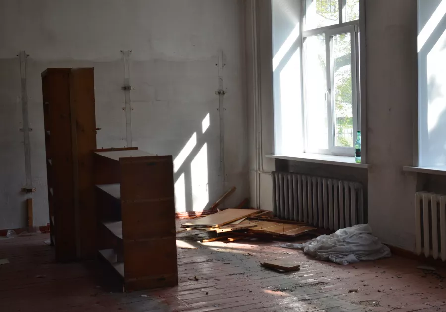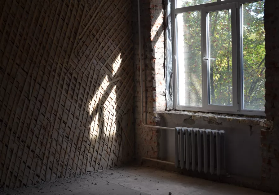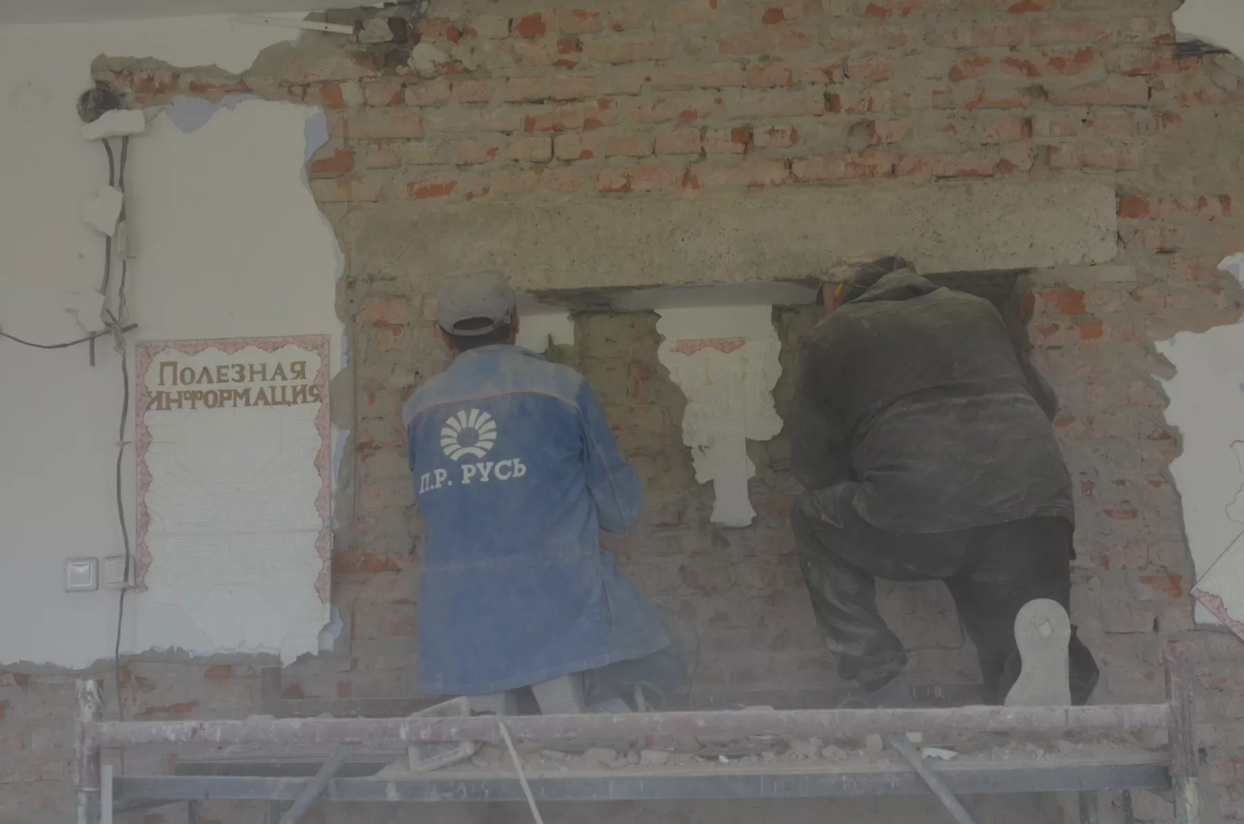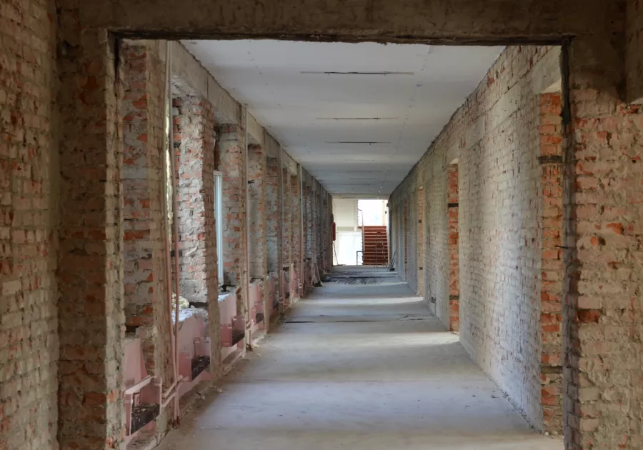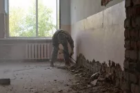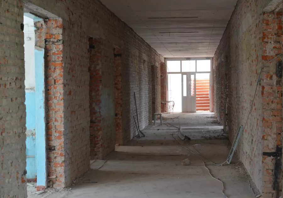 На данном этапе в школе уже выполнен демонтаж штукатурки. На следующем предполагается замена труб, ближе к зиме – демонтаж кровли, ее покрытие и замена некоторых стропильных систем.