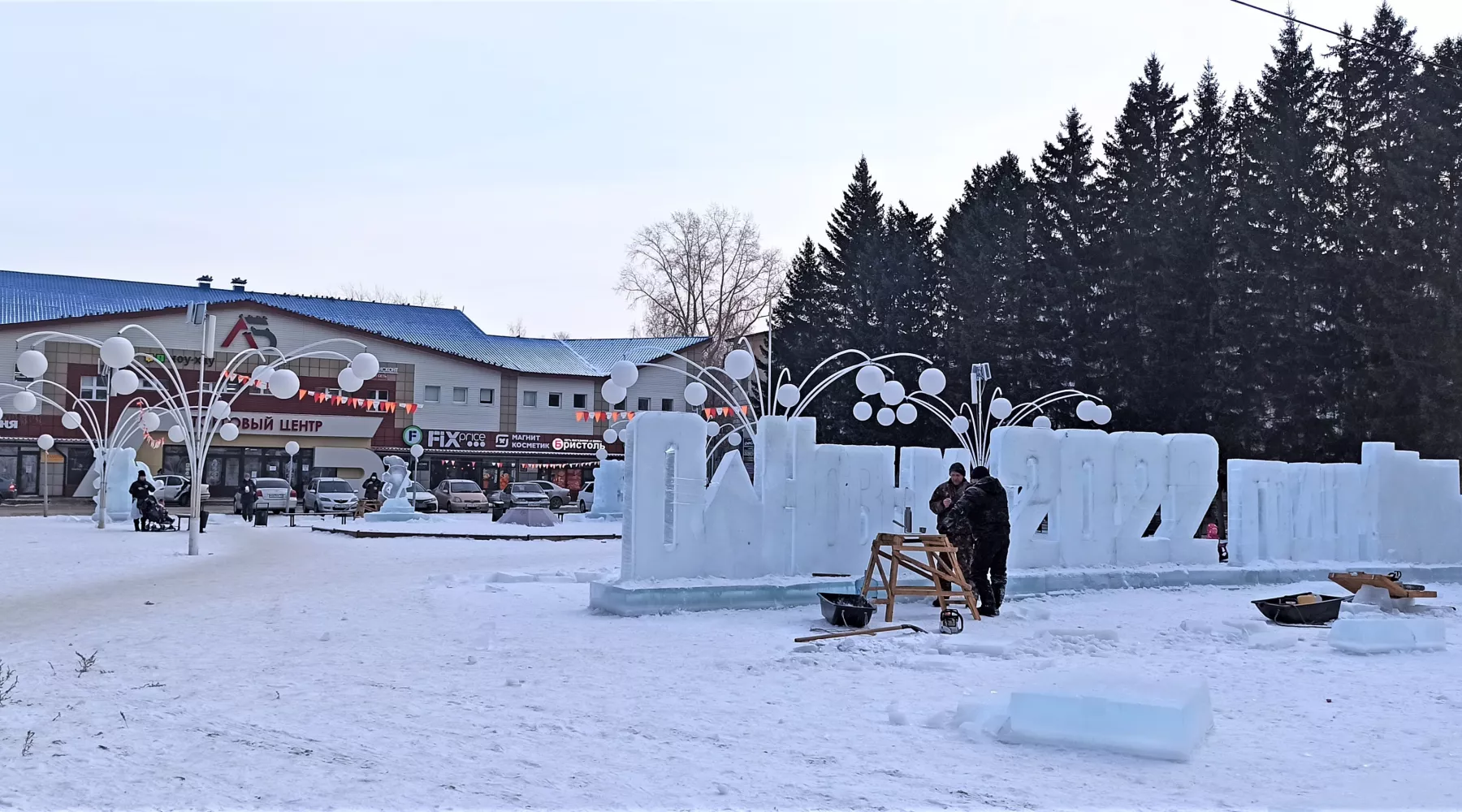 В начале площади, почти у дороги, уже установили ледяную надпись: «С Новым 2022 Годом!». Она ежегодно становится изюминкой снежного городка. Помимо нее, как нам стало известно, здесь установят фигуры изо льда в виде животных, символов Олимпиады. А вот Деда Мороза и Снегурочки нынче не будет. По словам скульпторов, на них заказчик средств не выделил.