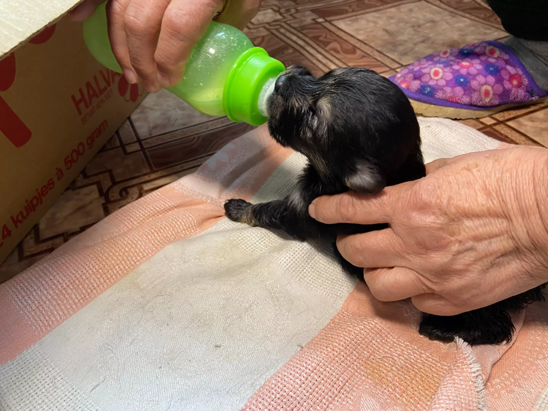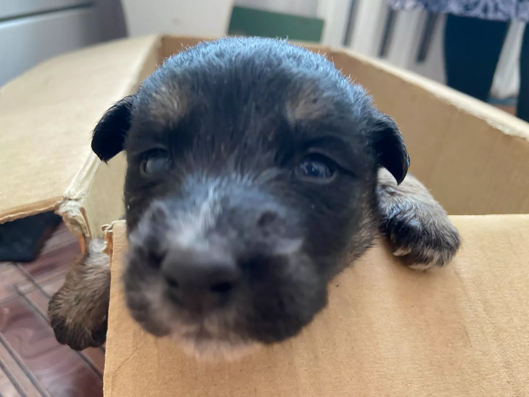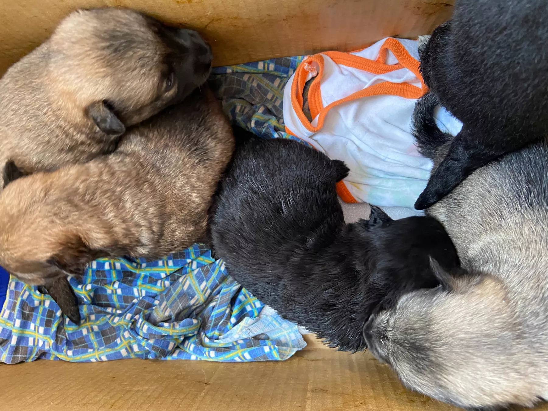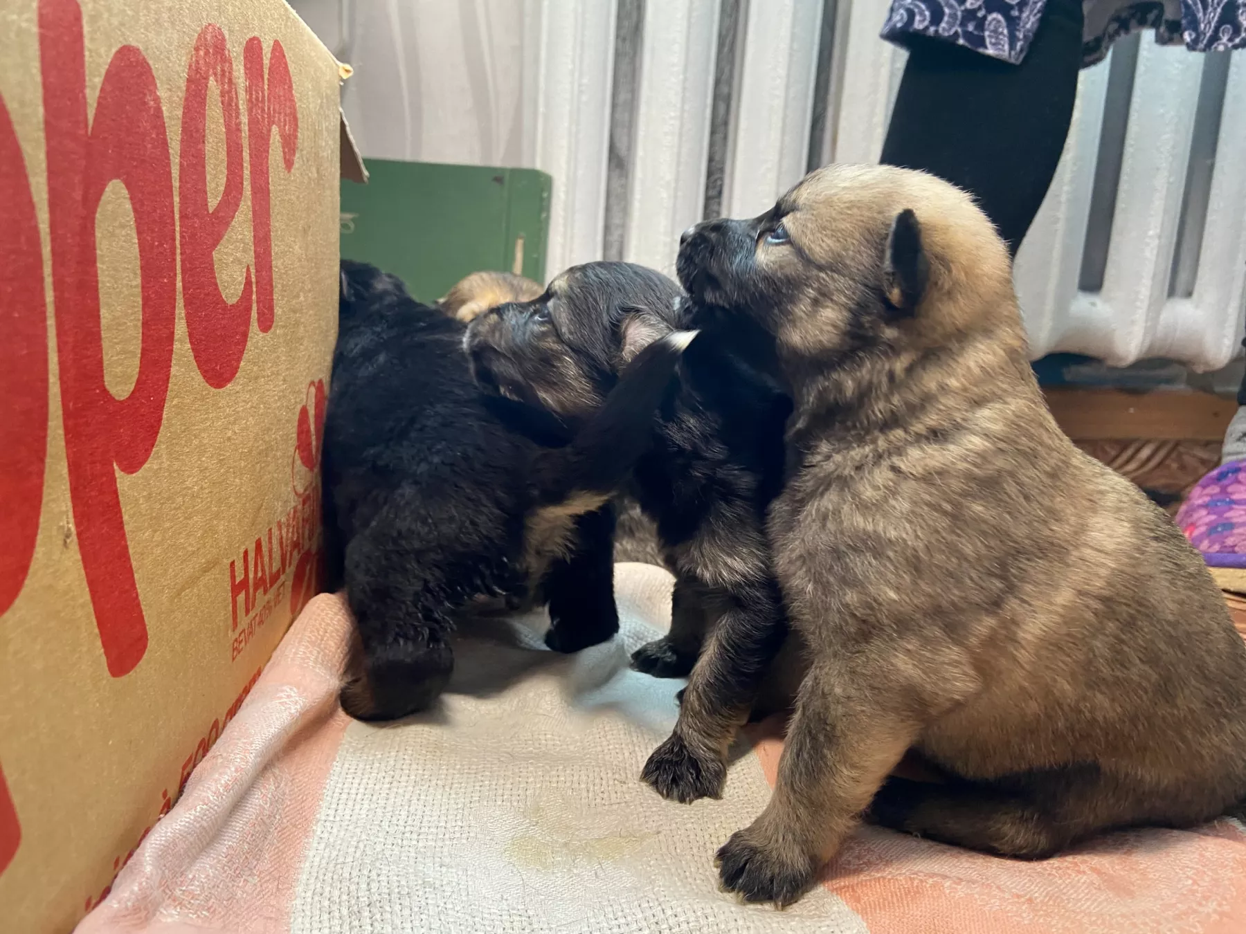 Два черных и три серых щеночка (один мальчик, а остальные девочки) уже открыли глаза. С хорошим молочным питанием они растут не по дням, а по часам. Поэтому коробка, в которой они сейчас находятся, становится маленькой для них.