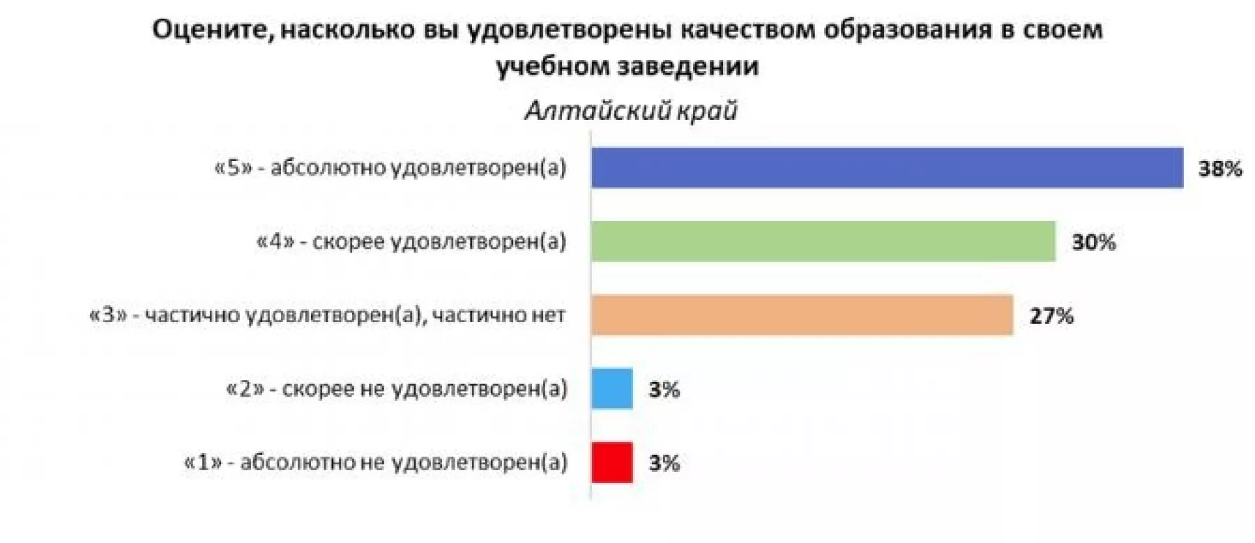 Так, студенты, которые учатся в вузах и ссузах Алтайского края оценивают учебные заведения на «4». Стоит отметить, что удовлетворены образованием 26 процентов студентов. А вот 6 процентов не довольны качеством получаемых знаний. Проведенный опрос показал, что 72 процента студентов-первокурсников при выборе направления обучения отталкивались от собственных интересов. 51 процент ориентировались на свои способности. И только 43 процента респондентов были заинтересованы, чтобы профессия была востребованной. К мнению родственников и родителей прислушивался каждый пятый будущий студент.