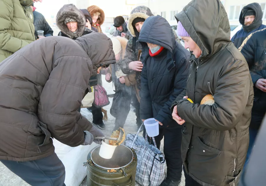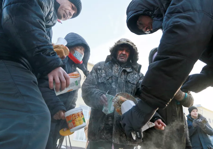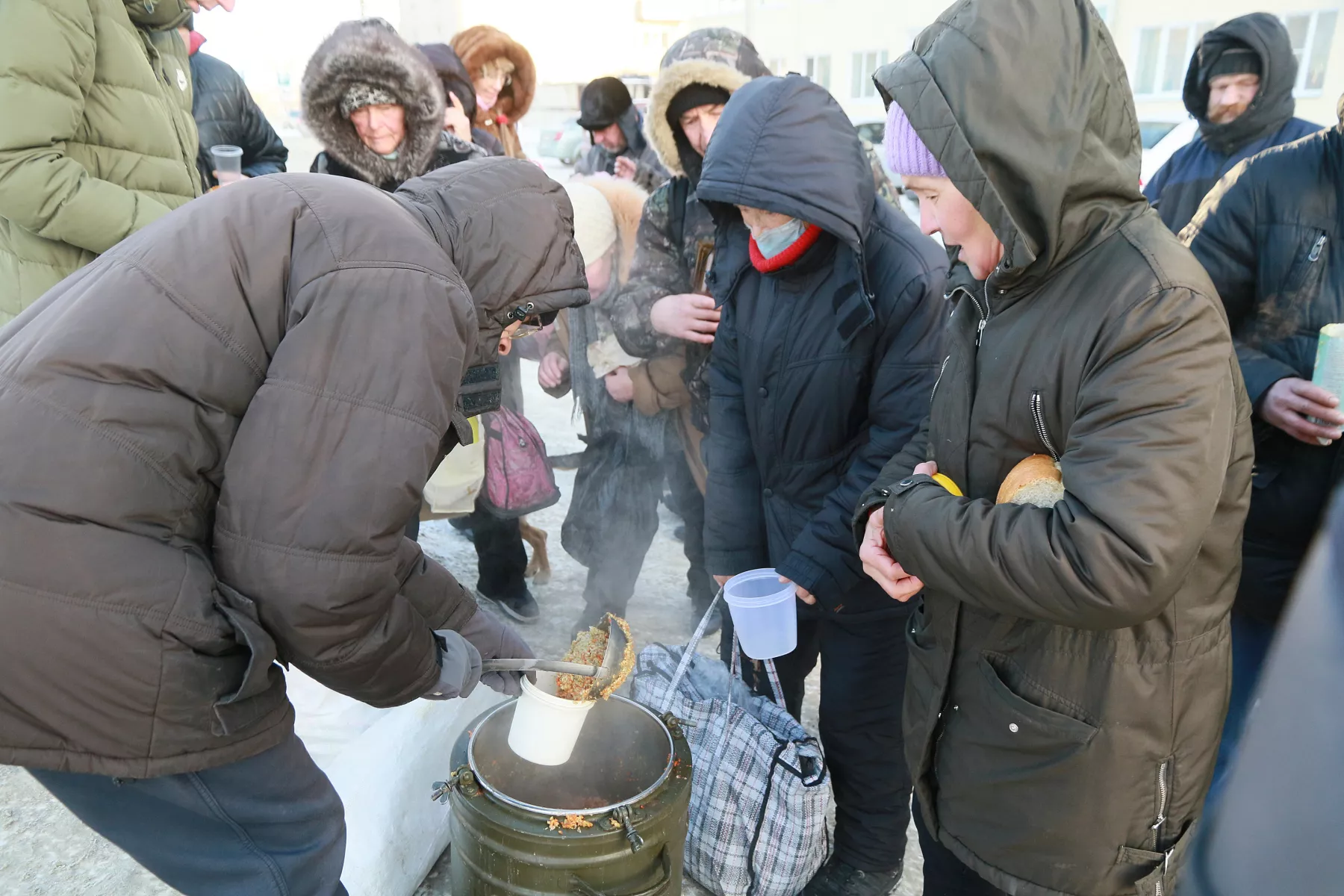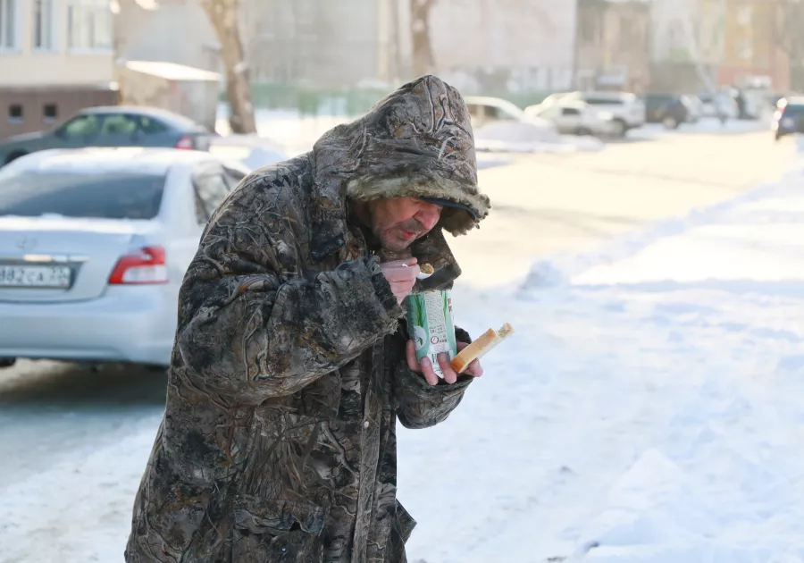 Мужчина специально приходит на Новый рынок за горячей едой от волонтеров, а по будням питается в районе вокзала. Там также есть точка, где неравнодушные люди подкармливают желающих горячей пищей.