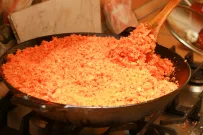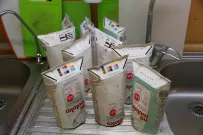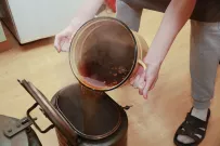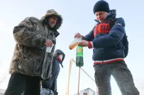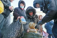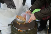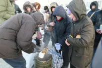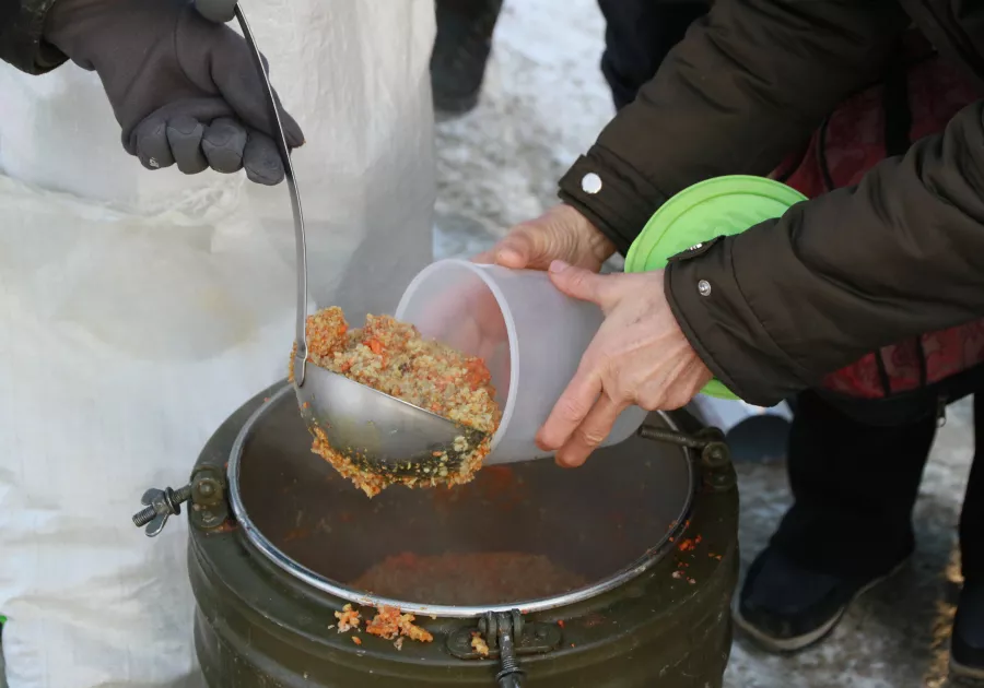 Каждое воскресенье, независимо от погоды, за бесплатной едой на Новый рынок приходит около трех десятков человек. Люди подставляют лотки и контейнеры под черпак с кашей, наливают чай с медом в бутылки или стаканчики, берут хлеб, а еще сладость. Кто-то начинает обед прямо тут на корточках, пока все горячее.