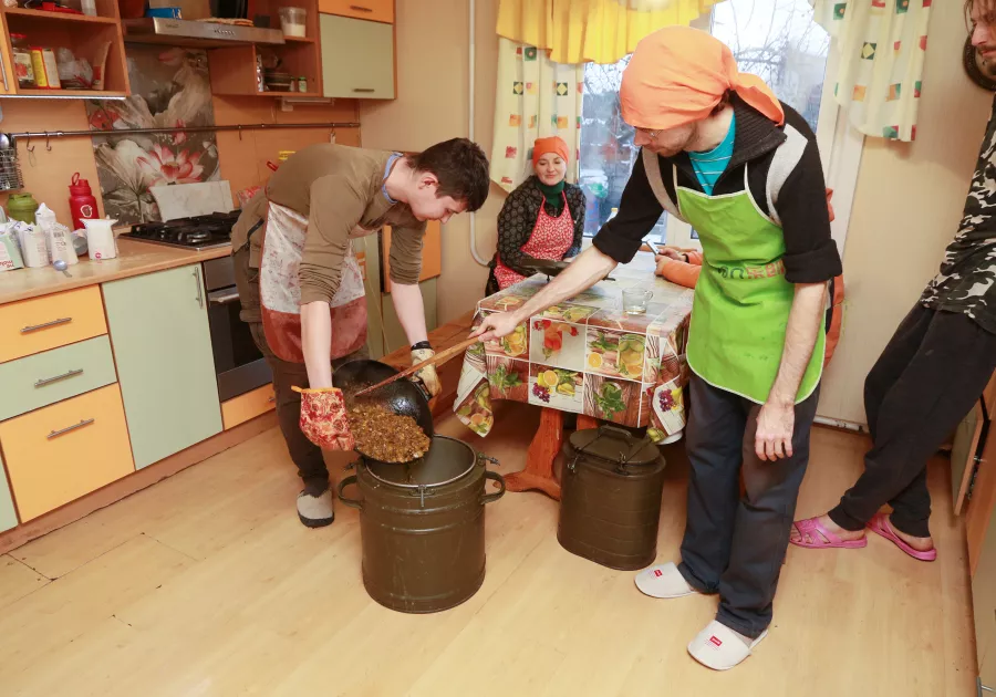 Вегетарианскую пищу для бездомных и всех нуждающихся готовят именно здесь. Для этих целей предусмотрена просторная кухня, оснащенная всей необходимой утварью. И каждое воскресенье сюда приходят новые волонтеры, а продукты приобретаются на средства неравнодушных горожан.