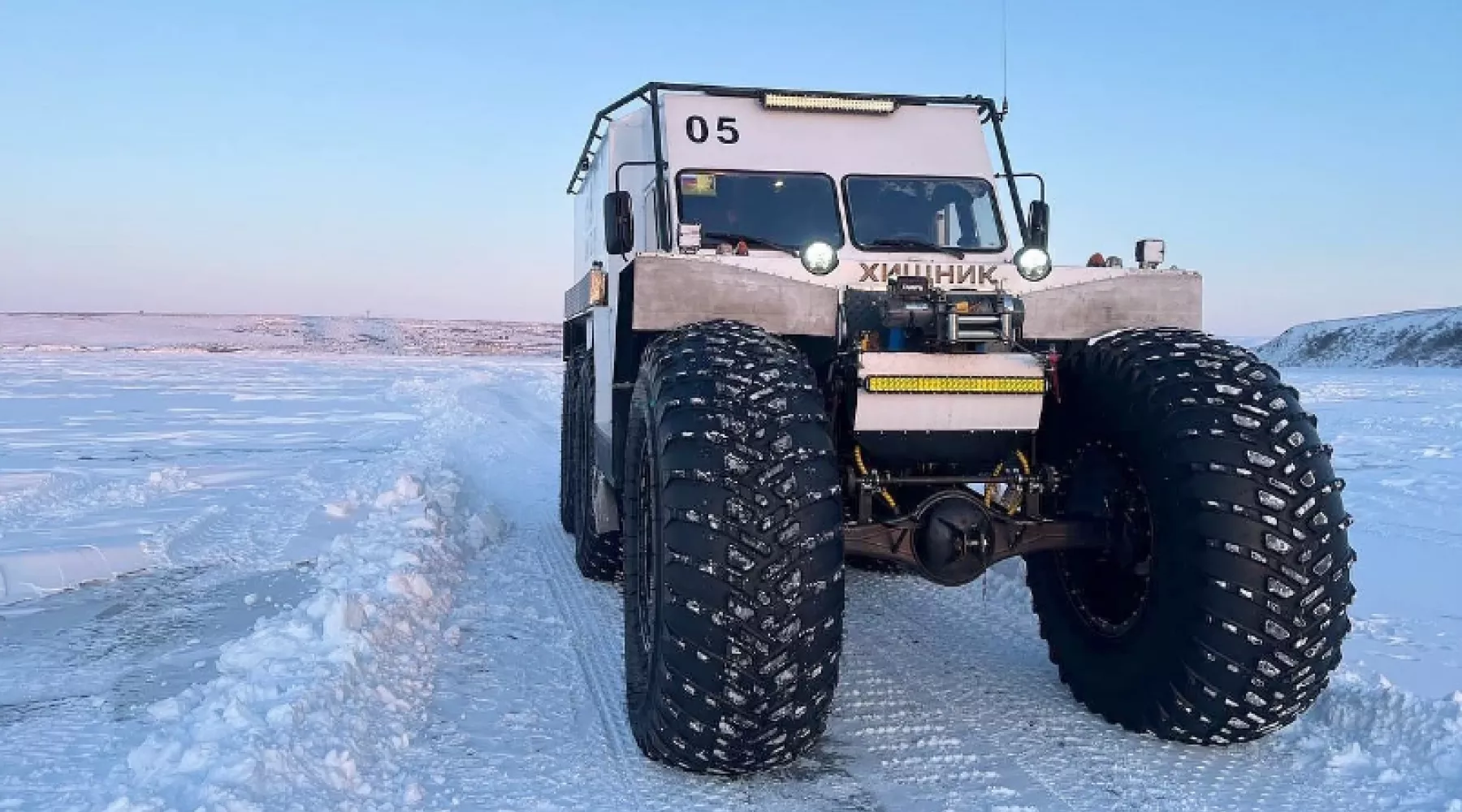 Вездеход "Хищник" - это автомобиль на огромных колесах сверхнизкого давления, которые в разы больше шин для стандартного внедорожника. Благодаря такой конструкции создается минимальное давление на грунт и машина уверенно двигается по снегу.