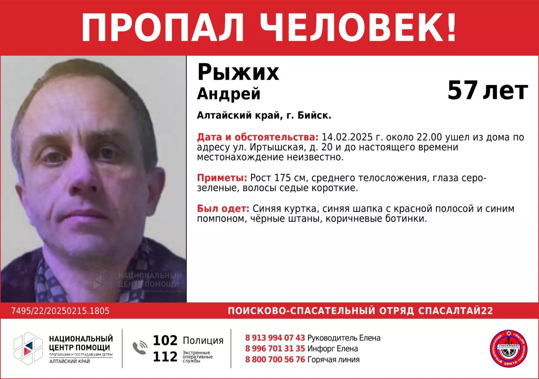 Мужчина 14 февраля в 22.00 ушел из дома по адресу ул. Иртышская, 20 и до настоящего времени его местонахождение неизвестно.