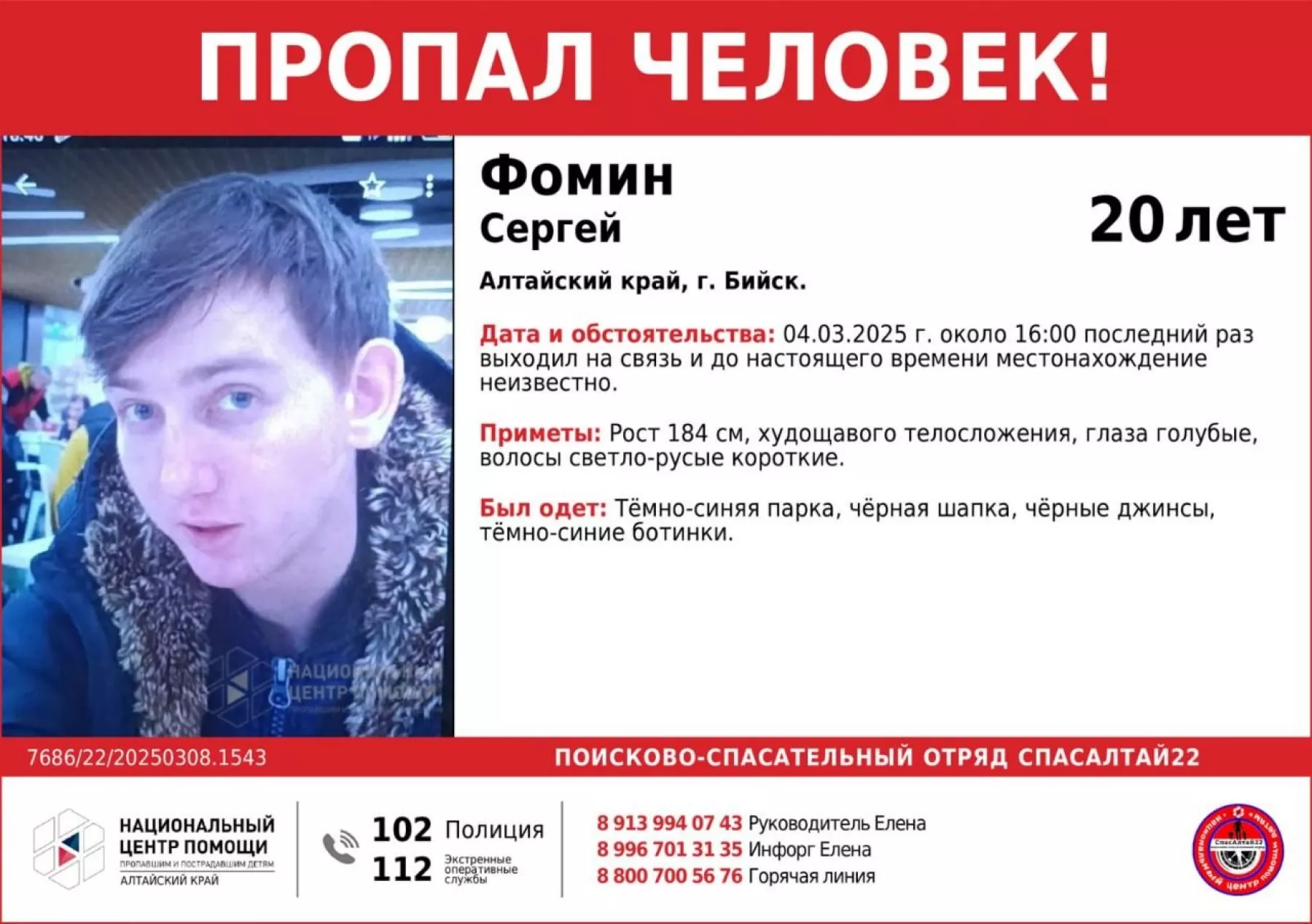В Бийске волонтеры ПСО «СпасАлтай22» разыскивают молодого человека, который в последний раз выходил на связь 4 марта. До настоящего времени его местонахождение неизвестно.