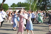 Следом под "Ах, эти тучи в голубом Напоминают море" потянулись пары. Со стороны казалось, что почти в каждой "ведет" прекрасная половина. Мужчины немного стеснялись, но довольно быстро освоились и вскоре уже с благодарностью кланялись зрителям, наградивших танцевавших бурными аплодисментами.