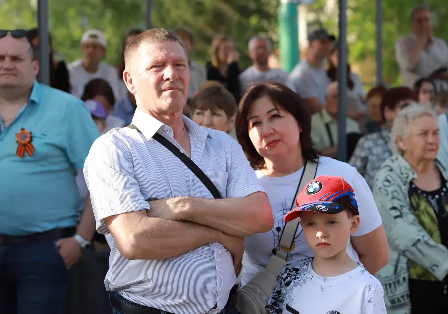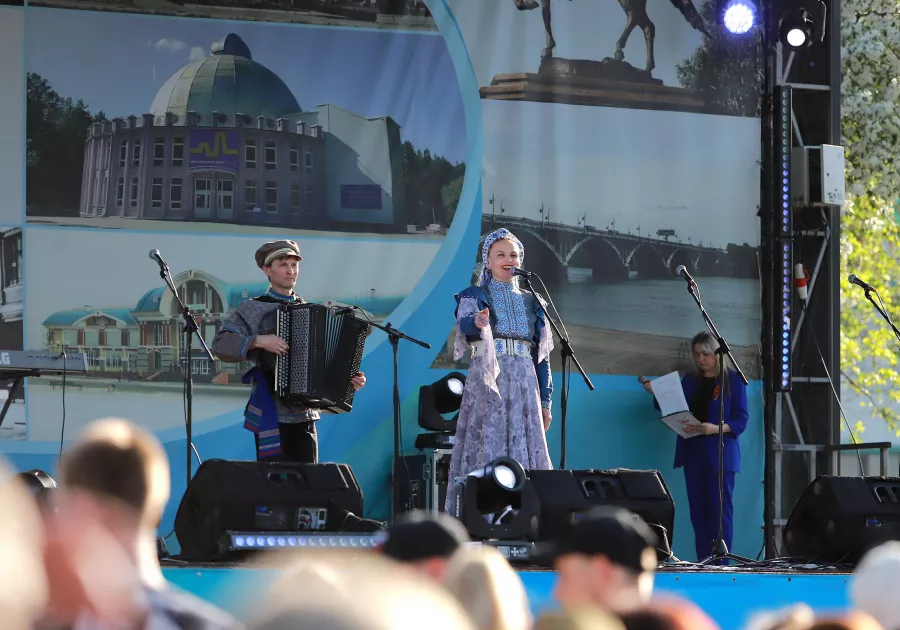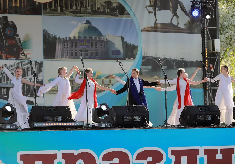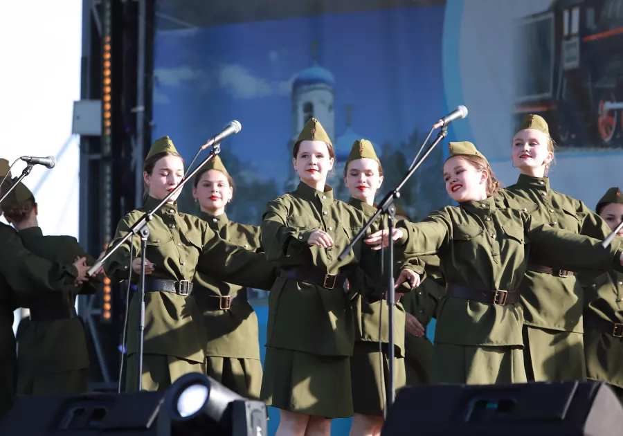 "Вальс Победы" открыл вечерную праздничную программу, посвященную 80-летию Победы, в ходе которой на сцену поднялись городские творческие коллективы, а главным гостем стал баритон Большого театра Владислав Чурсин.
