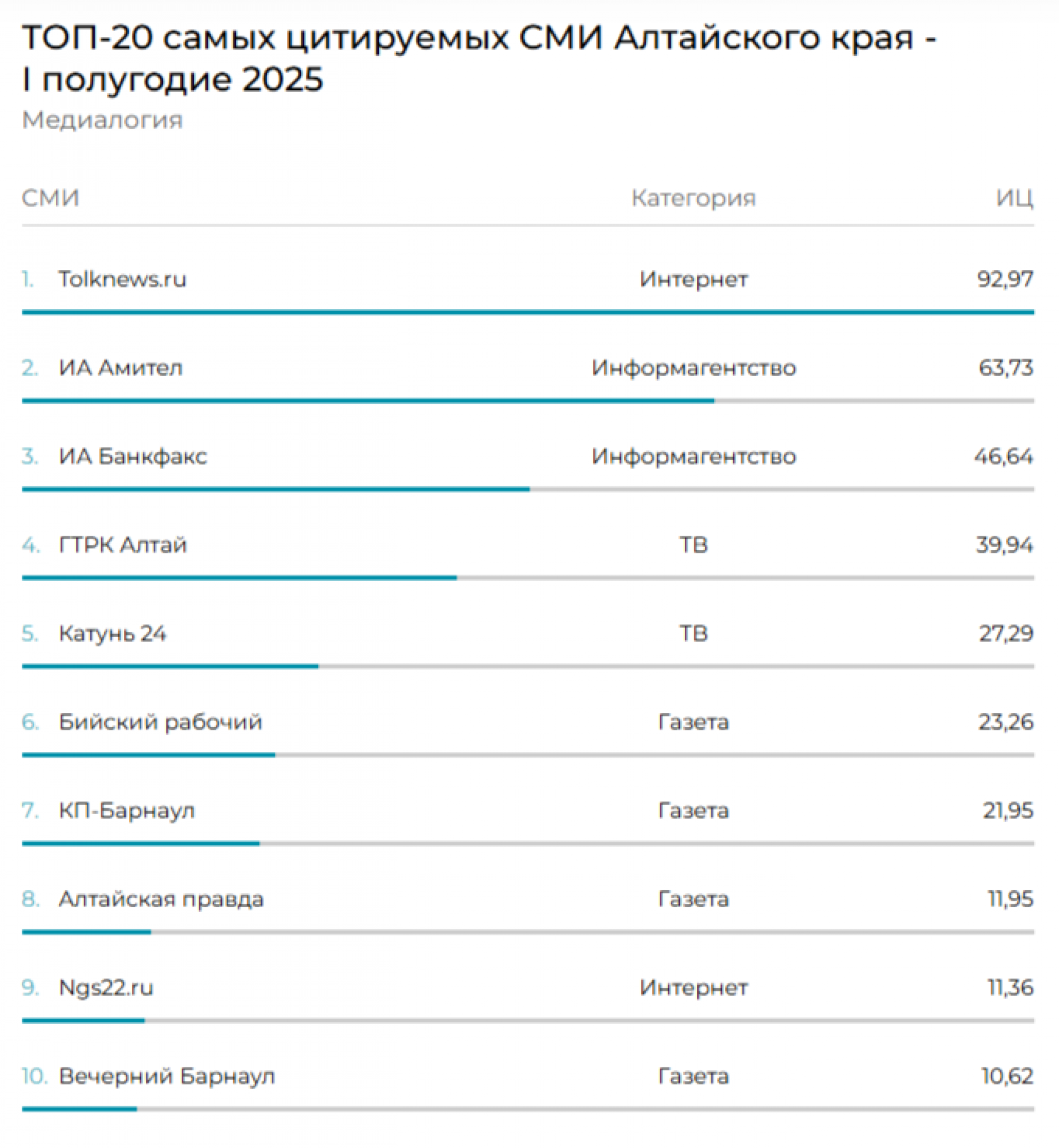 "Бийский рабочий" вошел в ТОП-10 самых цитируемых СМИ Алтайского края за I полугодие 2025 года. Рейтинг цитируемости СМИ Алтайского края подготовила компания "Медиалогия".