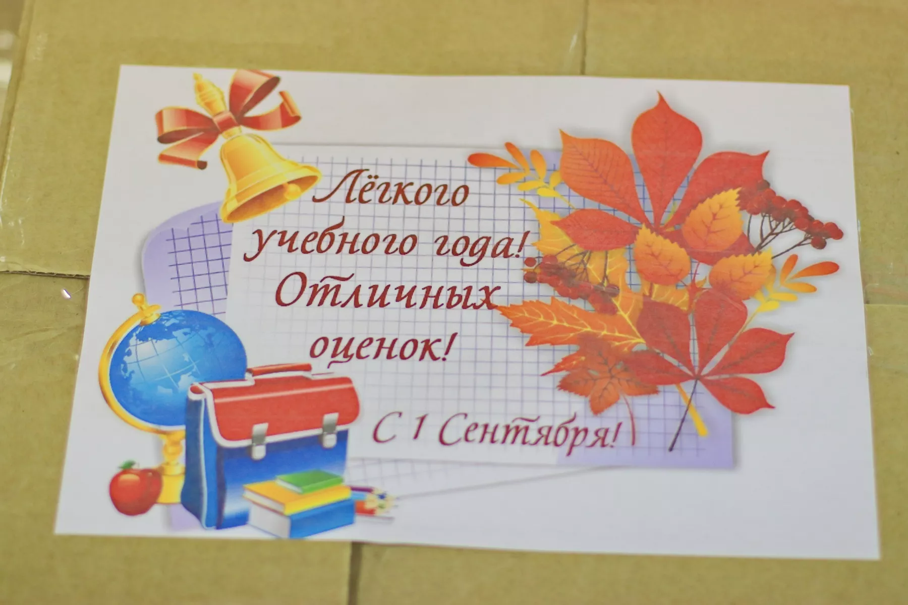 Стоит отметить, наборы тщательно упакованы в яркие и красочные коробки, на которых написаны поздравления с первым сентября, слова поддержки и приклеены красочные картинки. Также обязательно на каждой посылке указано наименование школы или садика, которые оказали помощь.