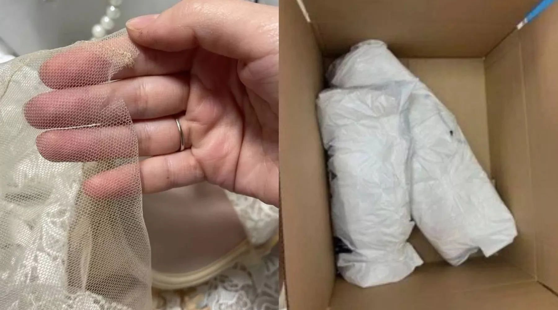 Платье, которое наконец-то доставили, оказалось поврежденным. Невеста сообщила, что изящная сетка на плече порвалась.