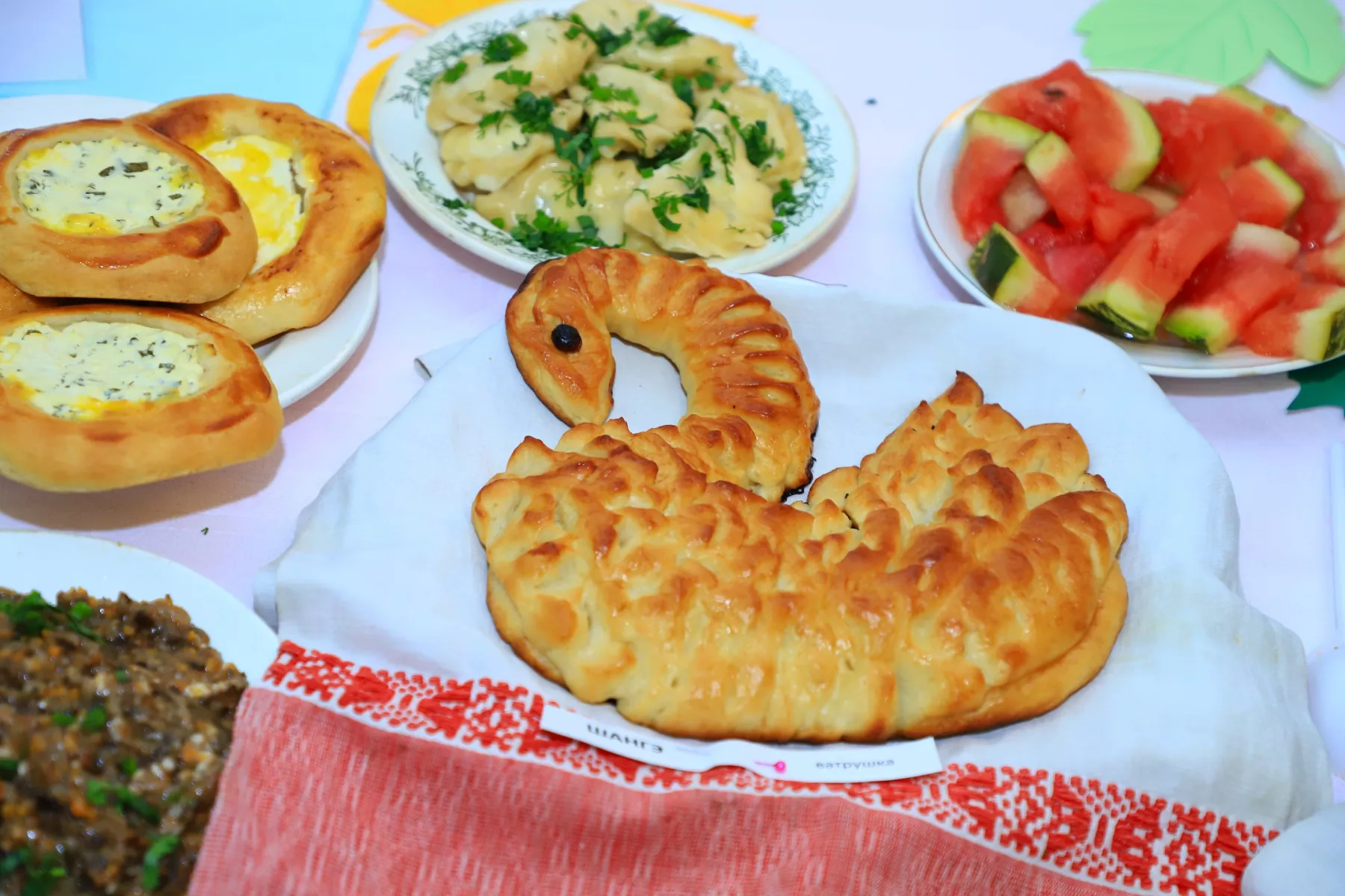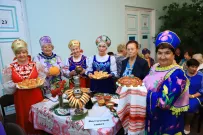 На столе Восточного совета ветеранов привычные глазу блюда: пироги, расстегаи, калачи. Настоящее украшение – русский каравай, украшенный лебедями.