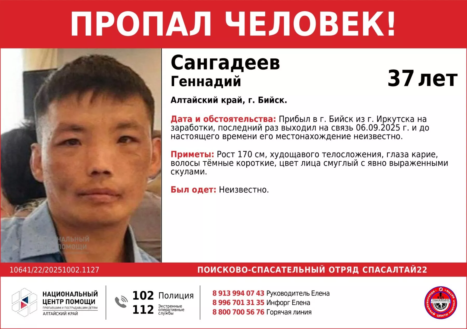 Волонтеры поисково-спасательного отряда «СпасАлтай22» разыскивают 37-летнего мужчину, который прибыл в Бийск из Иркутска на заработки. В последний раз мужчина выходил на связь 6 сентября 2025 года, до настоящего времени его местонахождение неизвестно. Информация об этом появилась в сообществе поискового отряда в соцсети «ВКонтакте».