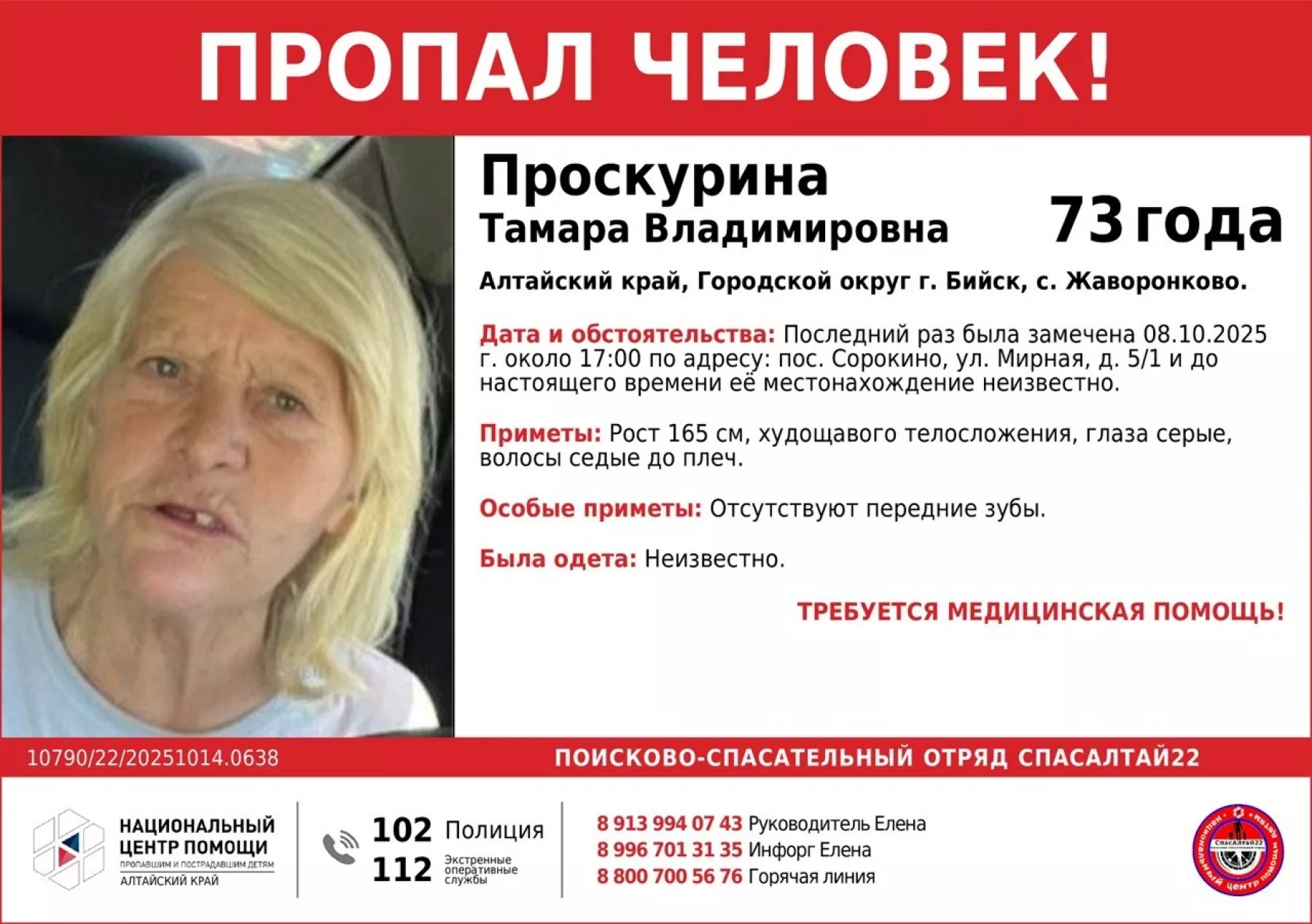 В с. Жаворонково пропала 73-летняя пенсионерка. Об этом сообщает «СпасАлтай22» в своем сообществе во «ВКонтакте».