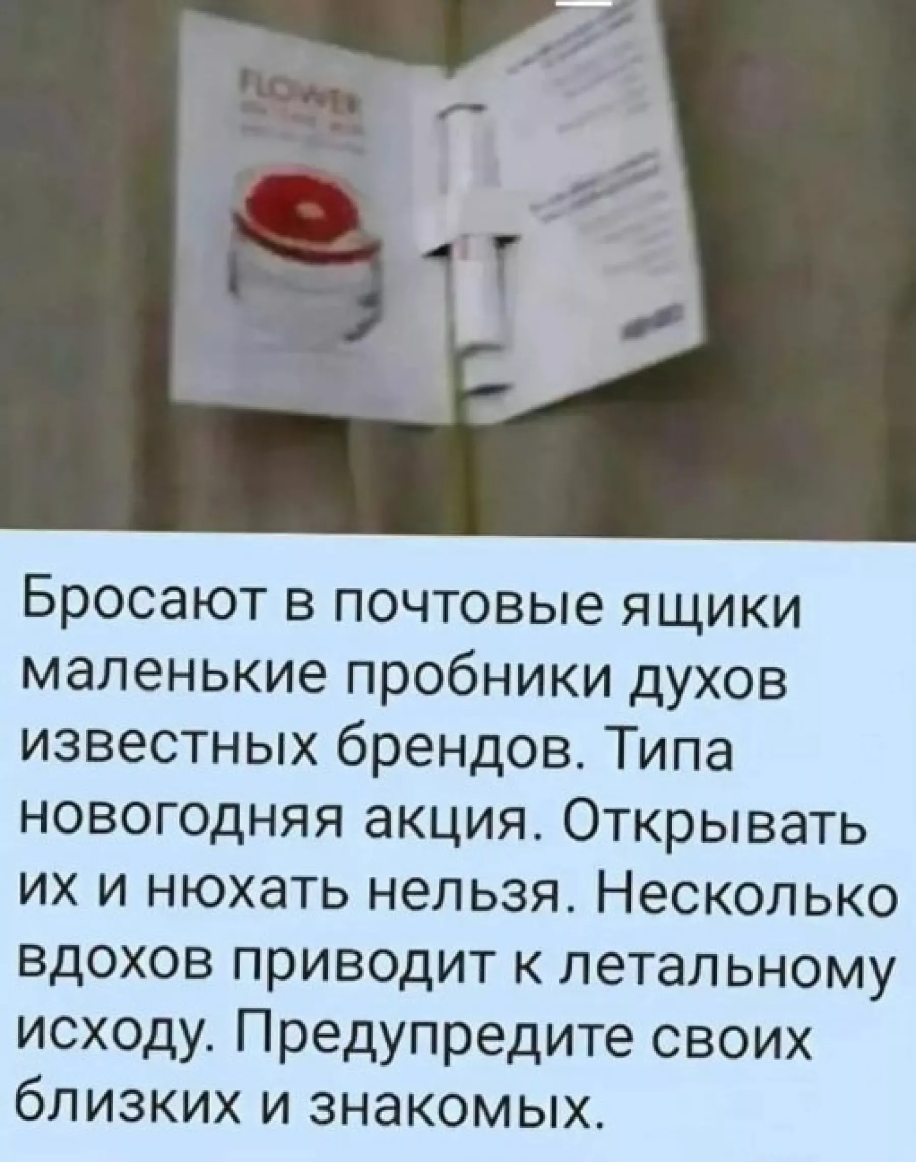 Кстати, фейк про духи со временем даже слегка менялся: в некоторых регионах писали о том, что якобы незнакомка предлагала прохожим понюхать пробник парфюма, после чего дегустаторы умирали.