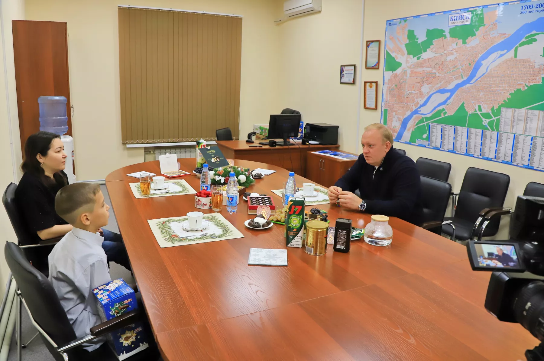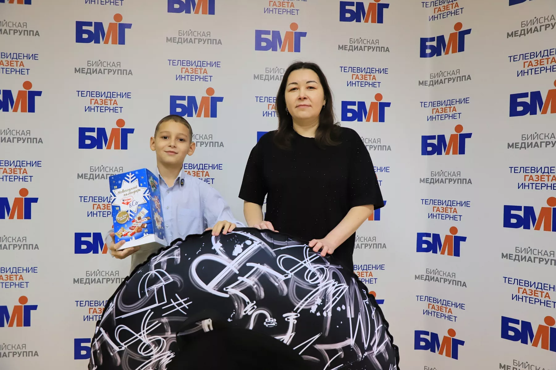 Немного стесняясь, на свой первый в этом году настоящий праздник, в сопровождении мамы зашла малышка Вика. Как и Миша, который не оставил Андрея Абрамова без ответного подарка (сделал ему браслет с надписью «Бийск»), протянула самодельную открытку. Сегодня эта юная спортсменка, хоть и «бережет фигуру», с удовольствием ест конфеты. Сладким подарком она поделится и со старшим братом.
