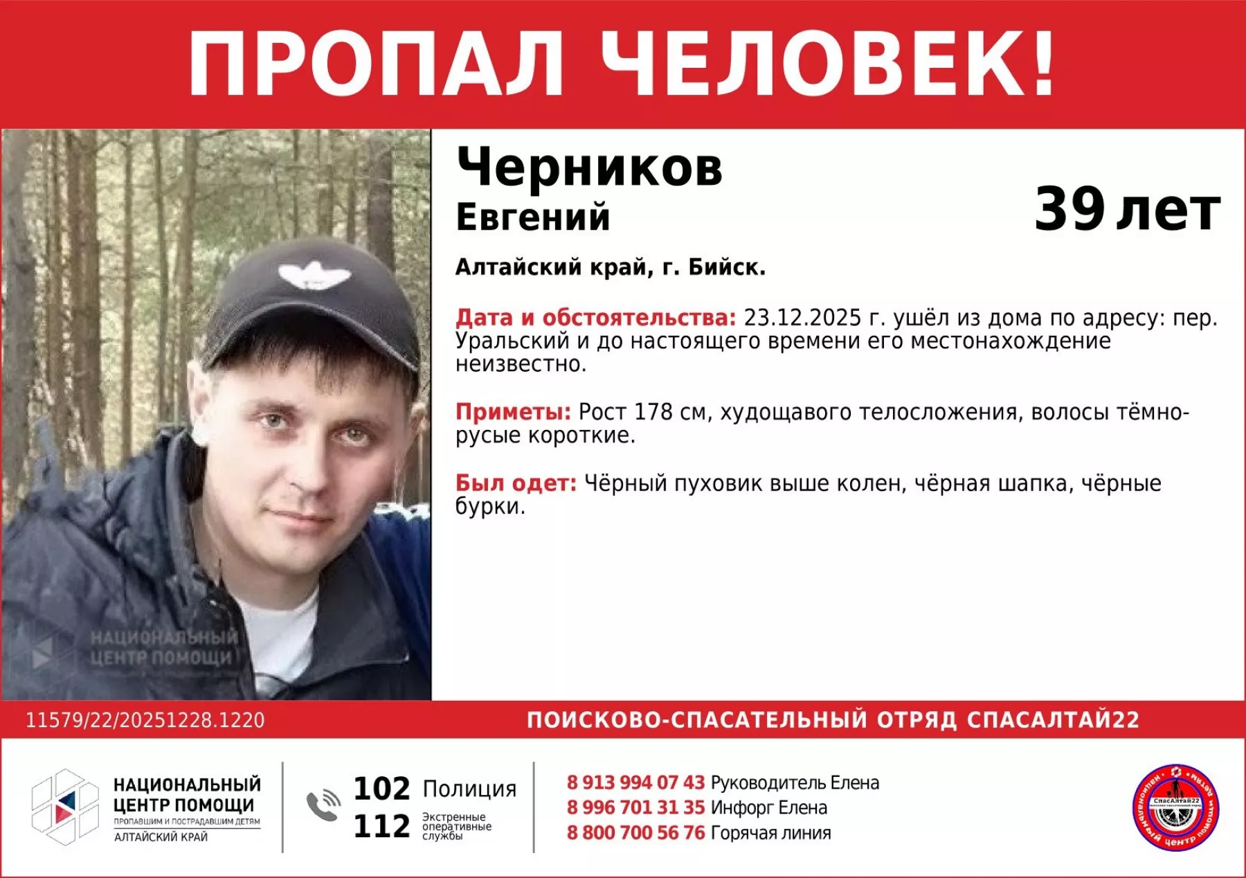 В Бийске уже почти неделю ищут мужчину. Об этом сообщает «СпасАлтай22». Пропавший 23 декабря вышел из дома по адресу: пер. Уральский, и до настоящего времени его местонахождение неизвестно.