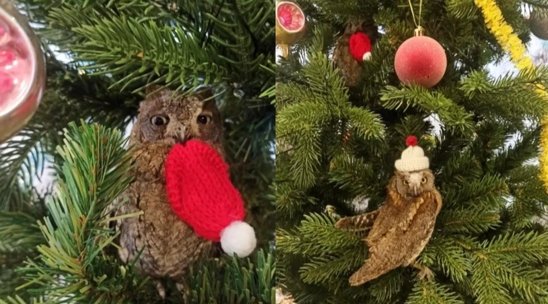 «Мы создаем совам физические нагрузки, как в природе. Совушки запрыгивают на новогоднюю елку и скачут внутри. Моня схватил шапочку-украшение и бегал с ней по ветвям. Фрай поспокойнее — сел на ветку и сидел, мы одели ему новогоднюю шапочку. Он так и сидел с ней, удалось сделать пару фото. А потом дальше продолжили тренировки для похудения».