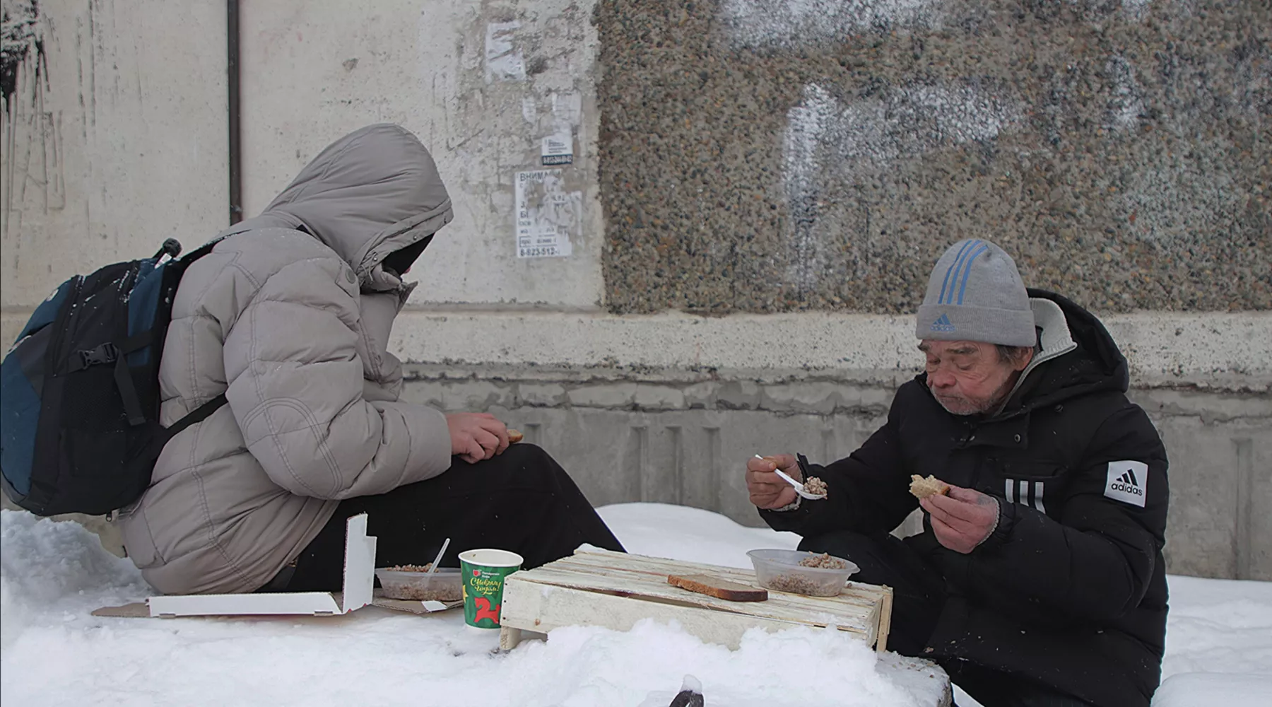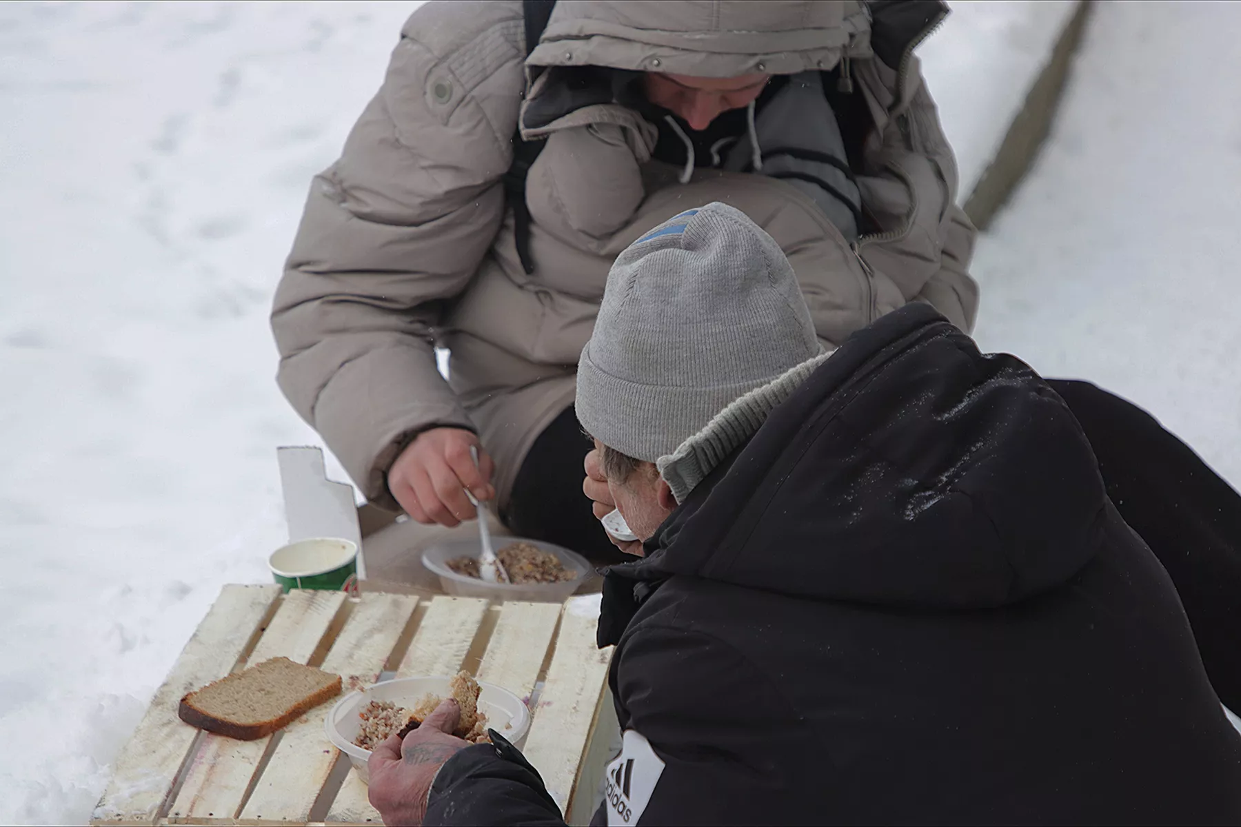 На снегу импровизированные столы – деревянные поддоны, а вместо скатерти аккуратно расстелены картонки. Из пластмассовых тарелок собравшиеся едят дымящуюся гречку, запивая ее сладким чаем. От добавки никто не отказывается. Организовывать такие обеды на пересечении улиц Социалистической и Ударной давно стало хорошей традицией. Различные некоммерческие и благотворительные организации разделили между собой зону ответственности, районы города и дни недели. Сегодня для тех, кто подошел и попросил тарелку с горячей пищей, в меню – каша.
