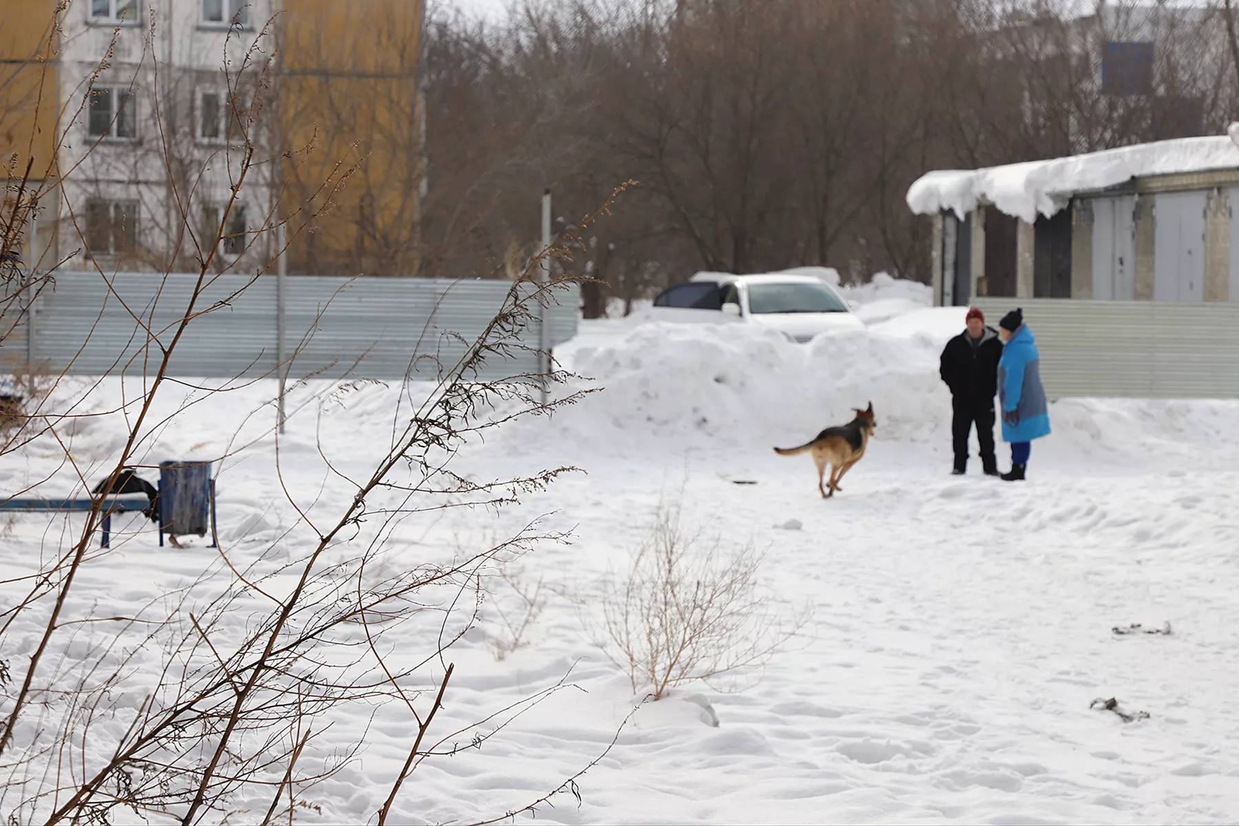 – Не подходите, собака без поводка! – предупреждает мужчина, выгуливающий овчарку рядом с одним из заброшенных строений.