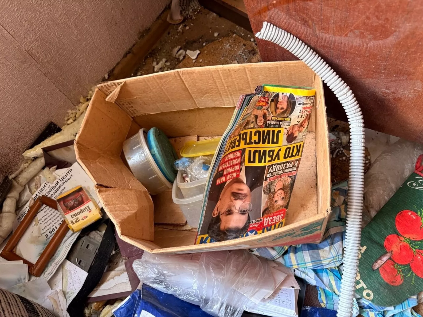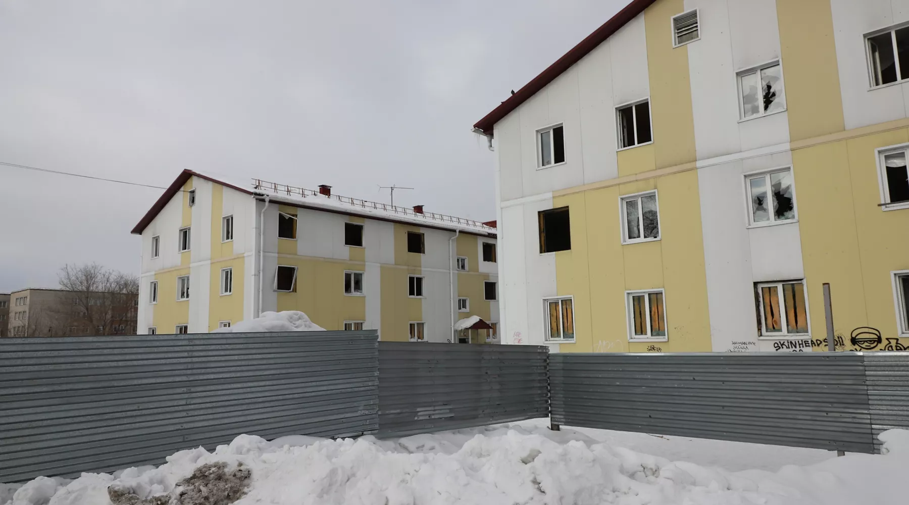 Большая часть подъездов заперта, но доступ есть в каждый – кое-где даже подставлена старая мебель, выполняющая роль лесенки. Там же, где двери подъезда нараспашку, царит хаос: в снегу, пепле от самодельных кострищ и обрывках обоев лежат брошенные жильцами вещи. Чаще всего, это старая мебель, сантехника, кухонная утварь, одежда, детские игрушки. Встречаются книги и периодика: вот кто-то читал «Колеса» Артура Хейли, а кто-то из желтой прессы пытался узнать, кто убил Владислава Листьева.