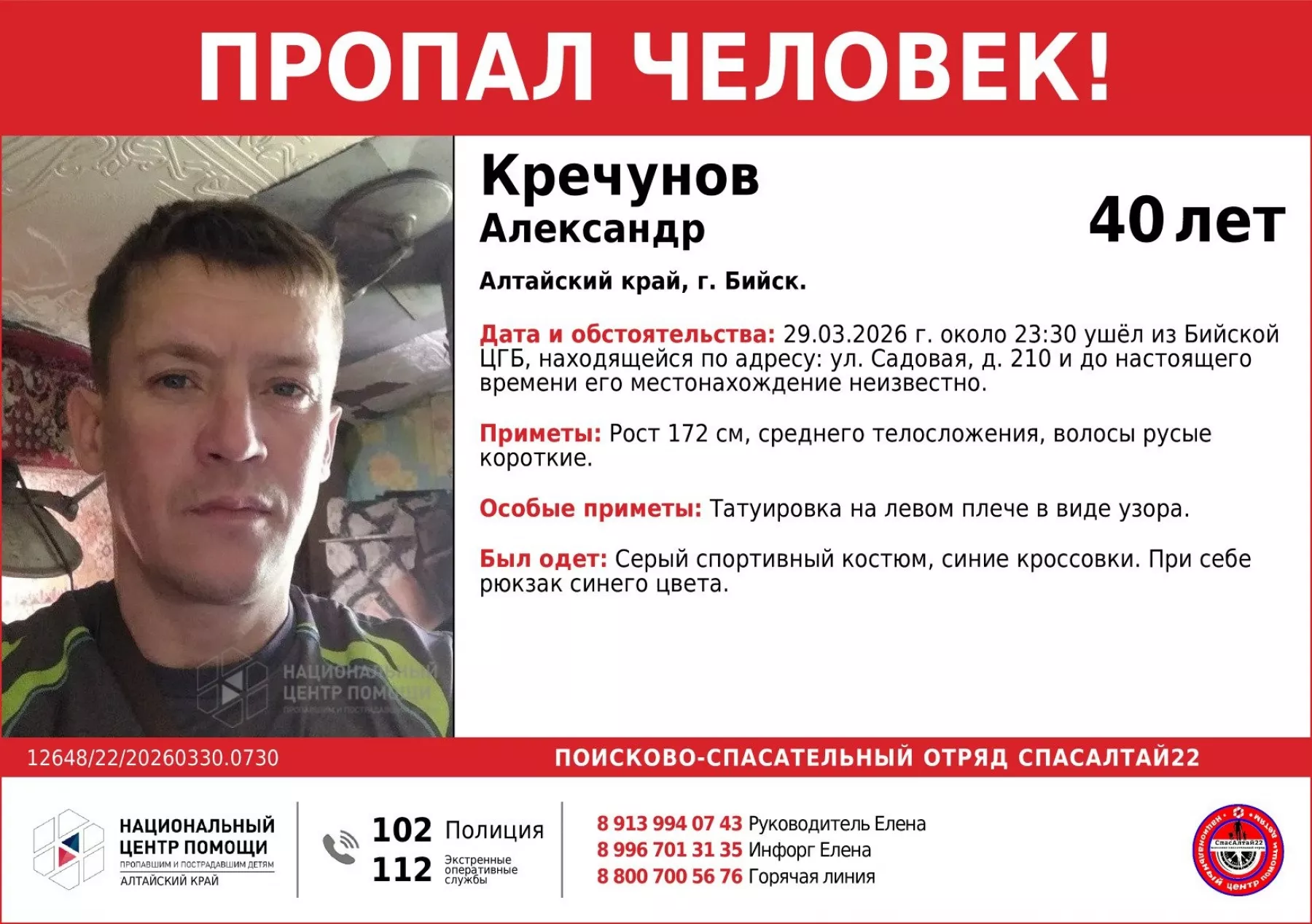 В Бийске 29 марта пропал 40-летний мужчина. Об этом сообщает "СпасАлтай22".
