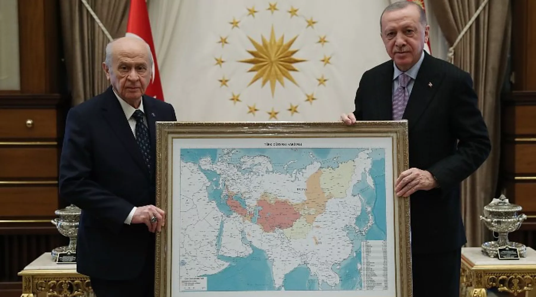 Лидер Партии националистического движения Девлет Бахчели подарил президенту Турции Реджепу Тайипу Эрдогану карту "Тюркского мира", в которую была включена половина территории Российской Федерации.